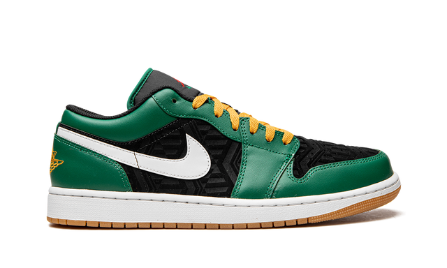 The Air Jordan 1 Low SE “Holiday Special” is a colorway of the lifestyle shoe inspired by the holiday season, specifically Christmas. The shoe features a black leather base with a subtle geometric pattern. Contrasting green leather overlays and a white leather Swoosh add to the look. A yellow “Wings” logo is embroidered on the heel and a red Jumpman is paired with green “Air” branding on the black nylon tongue. The shoe’s yellow laces add a pop of color to the design. Underfoot, a white midsole and gum rubber outsole complete the look.
