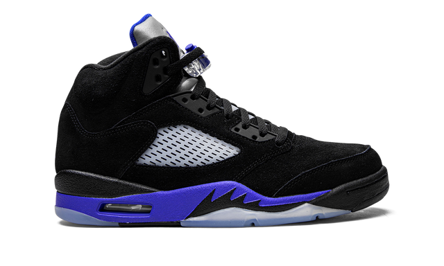 The Air Jordan 5 “Racer Blue” is a February 2022 release of Michael Jordan’s classic signature shoe in a colorway that is reminiscent of the original “Black Metallic” colorway. This “Racer Blue” edition replaces red accents with royal blue, and adds even more color by featuring a blue midsole, as well. The upper is constructed in black synthetic nubuck with translucent mesh panels on the sides and tongue. The silver reflective tongue has a Racer Blue embroidered Jumpman and a Racer Blue Jumpman is embroidered on the heel. Additional Racer Blue accenting comes into play on the underside of the tongue, on the toggle on the clear lace lock, and on the midsole with silver shark tooth-inspired detailing.