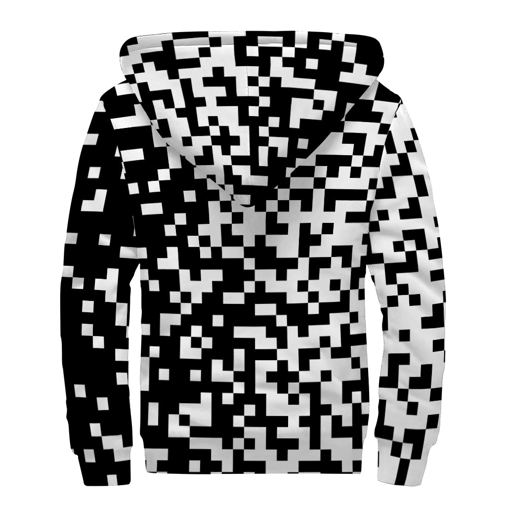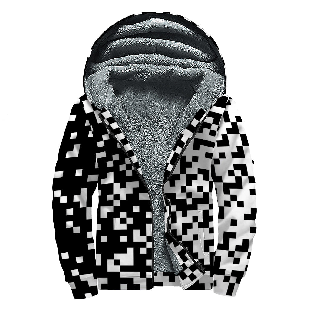 Black And White Pixel Pattern Print Sherpa Lined Zip Up Hoodie For Boho Hippie Autism