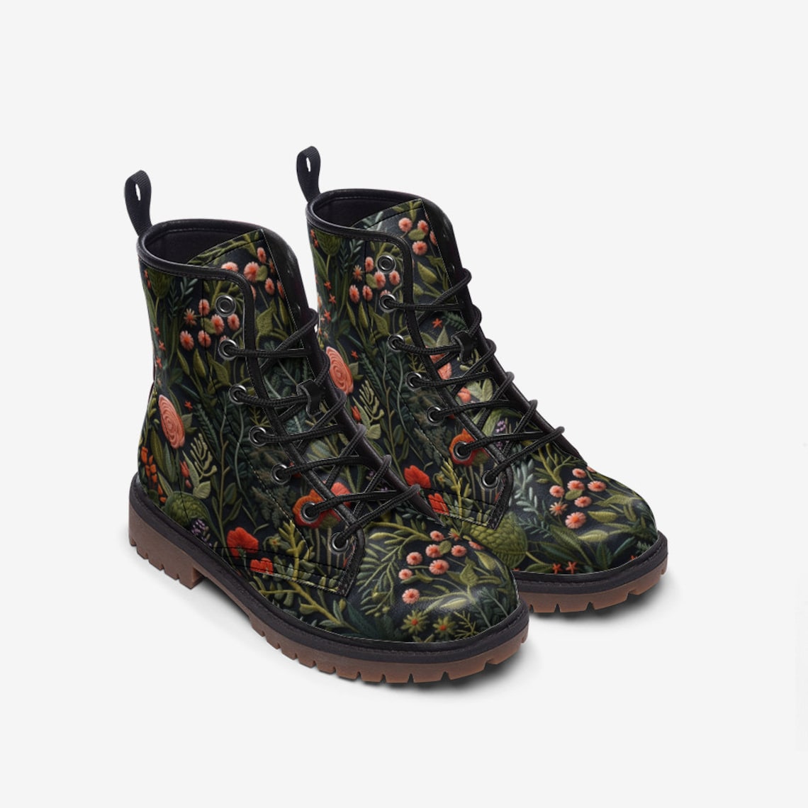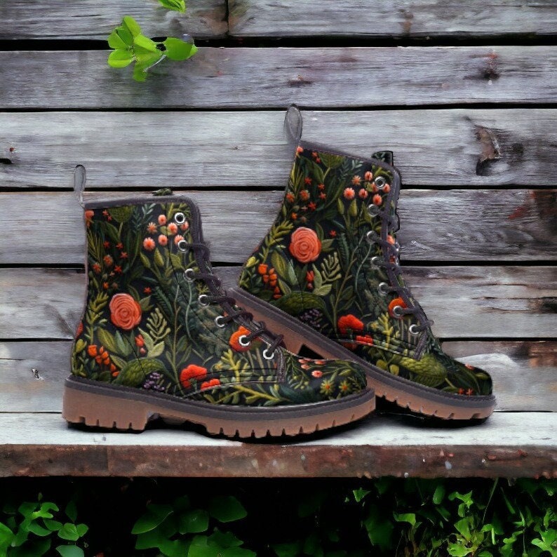 Hippie Art Zone - Dark Cottagecore Faux Embroidery Flowers Combat Boots.