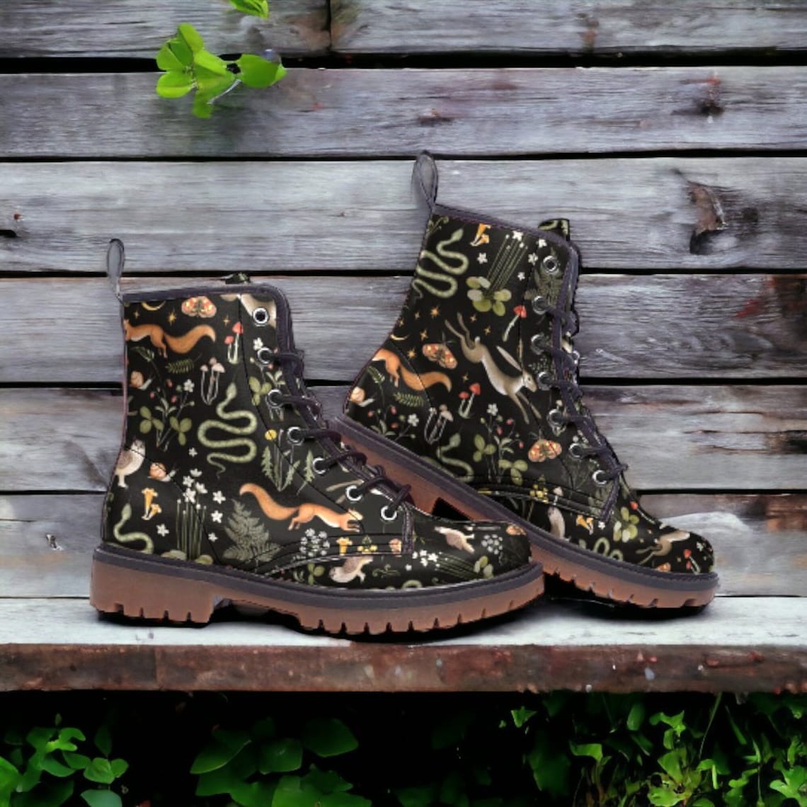 These hippieartzone Horse Boots & Leg Wraps are perfect for any free-spirited hippie looking to add a touch of nature-inspired style to their outfit. The woodland mushrooms design on the combat boots is unique and whimsical, making a statement wherever you go. The leg wraps add an extra bohemian touch, perfect for festivals, nature walks, or just adding a bit of flair to your everyday look. Made with high-quality materials, these boots are not only stylish but also durable and comfortable for all-day wear. Embrace your inner hippie with these one-of-a-kind Horse Boots & Leg Wraps from hippieartzone.