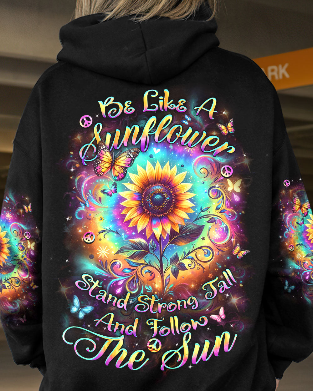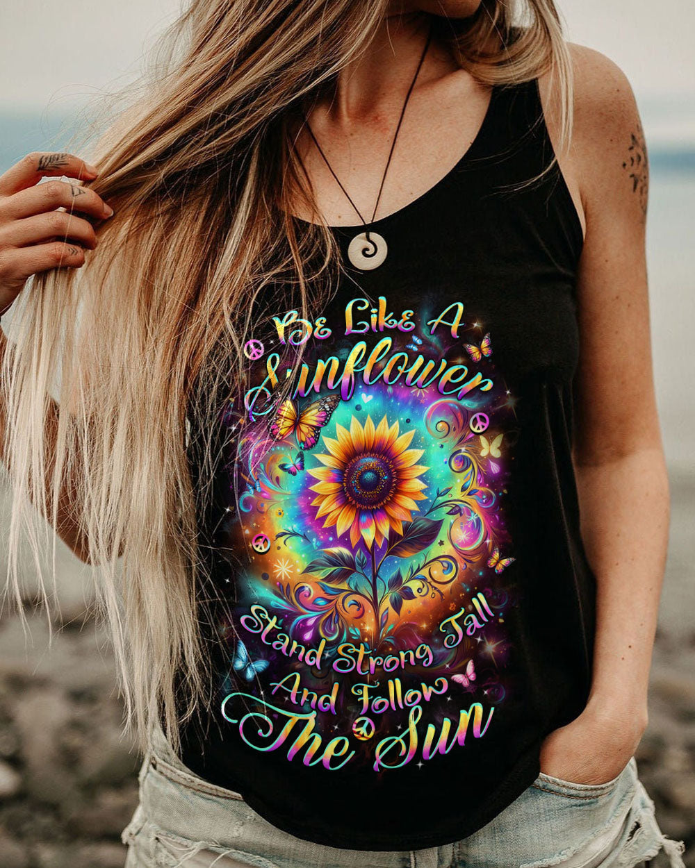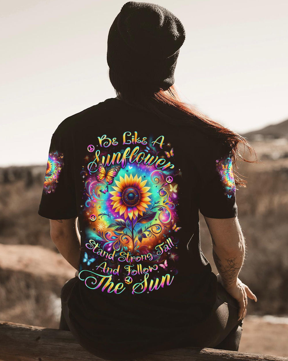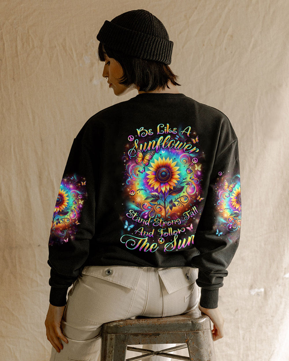 The all-over "Be Like a Sunflower" print features a cheerful sunflower design with a simple, positive message. Perfect for those who love nature and are always optimistic. Made from a soft, lightweight fabric, this print is comfortable for everyday wear. The bright, uplifting design adds a playful touch to any outfit, making it a great choice for casual or relaxing outings.