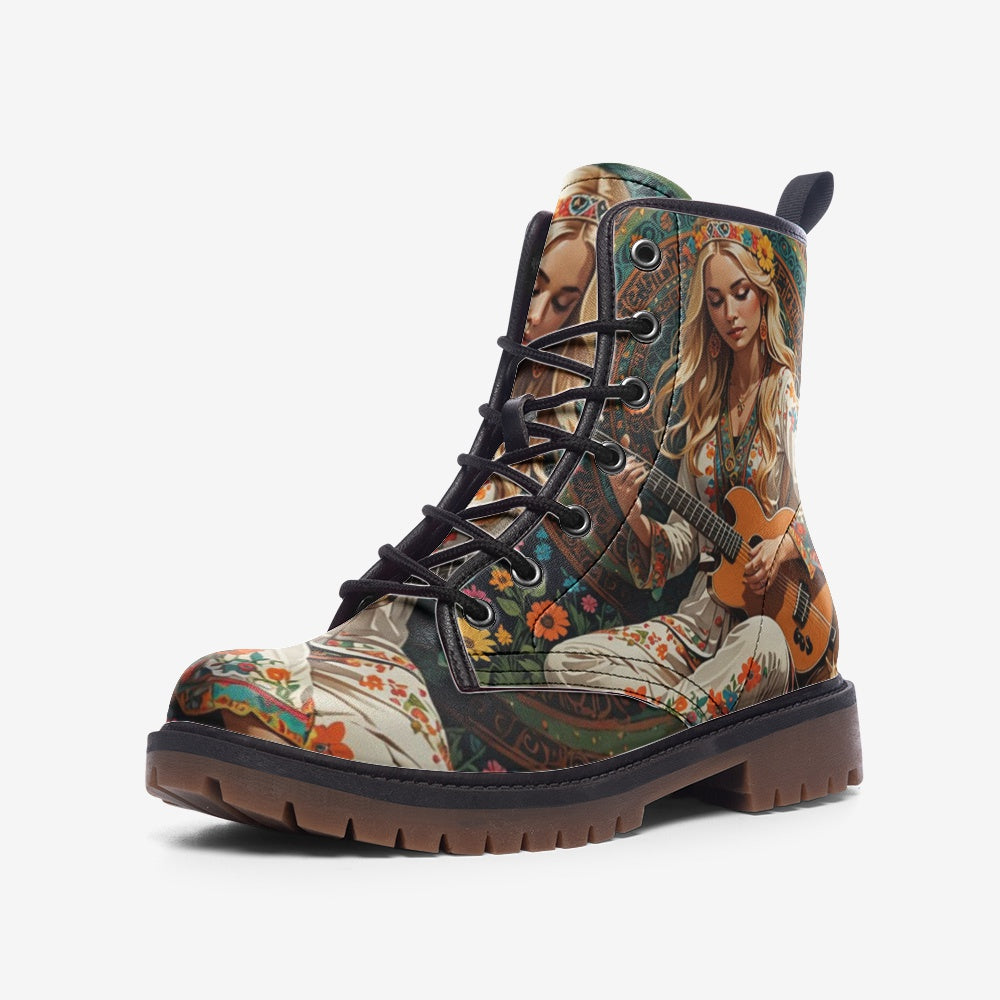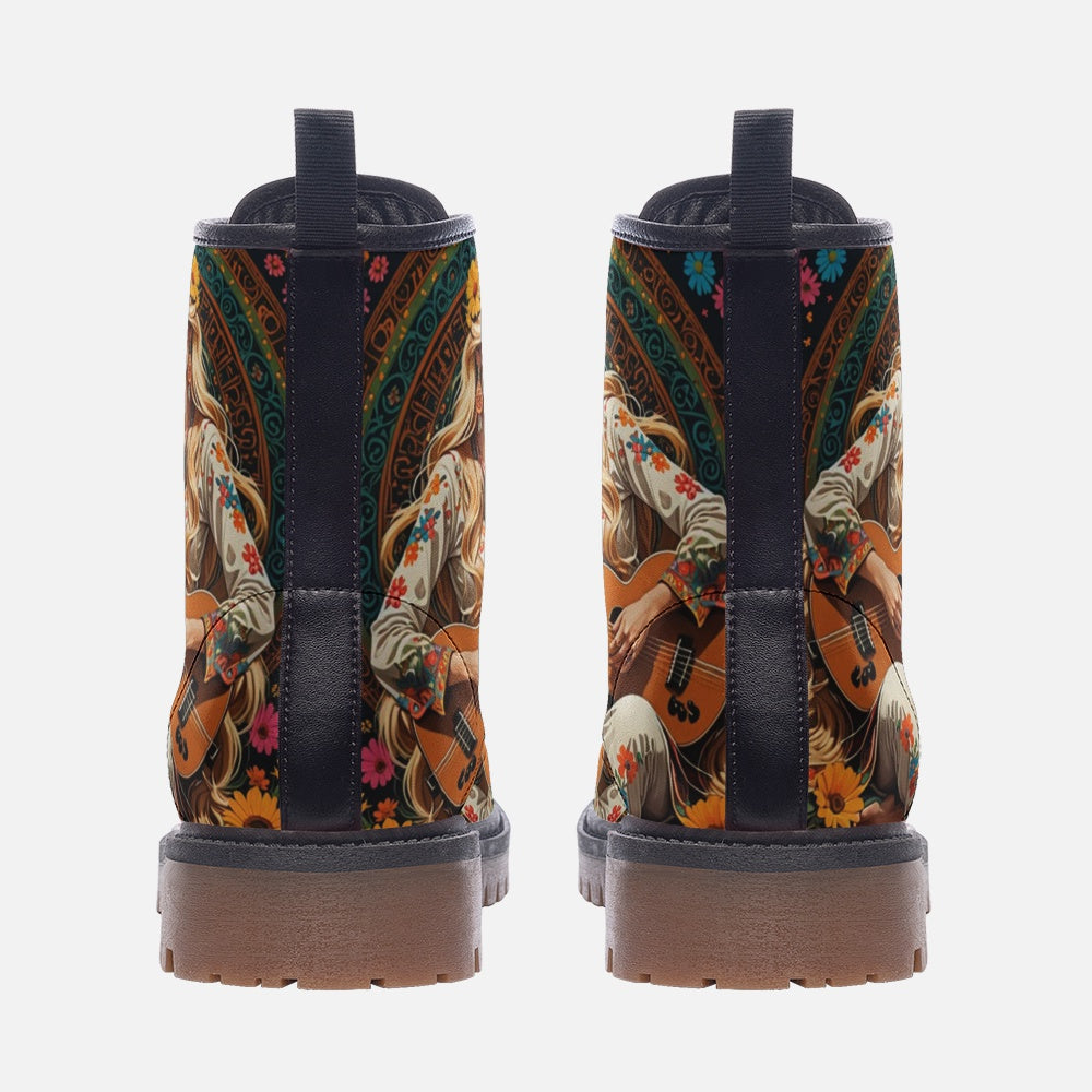 Strike a chord with the Blonde Guitarist boots. Showcasing a bohemian woman with blonde hair playing guitar, these casual leather boots celebrate the rhythm of music and the free-spirited soul. Lightweight and crafted for comfort, they're ideal for hippies who live for the melodies of life and the joy of self-expression. Step into these boots and let your musical spirit guide your journey.
