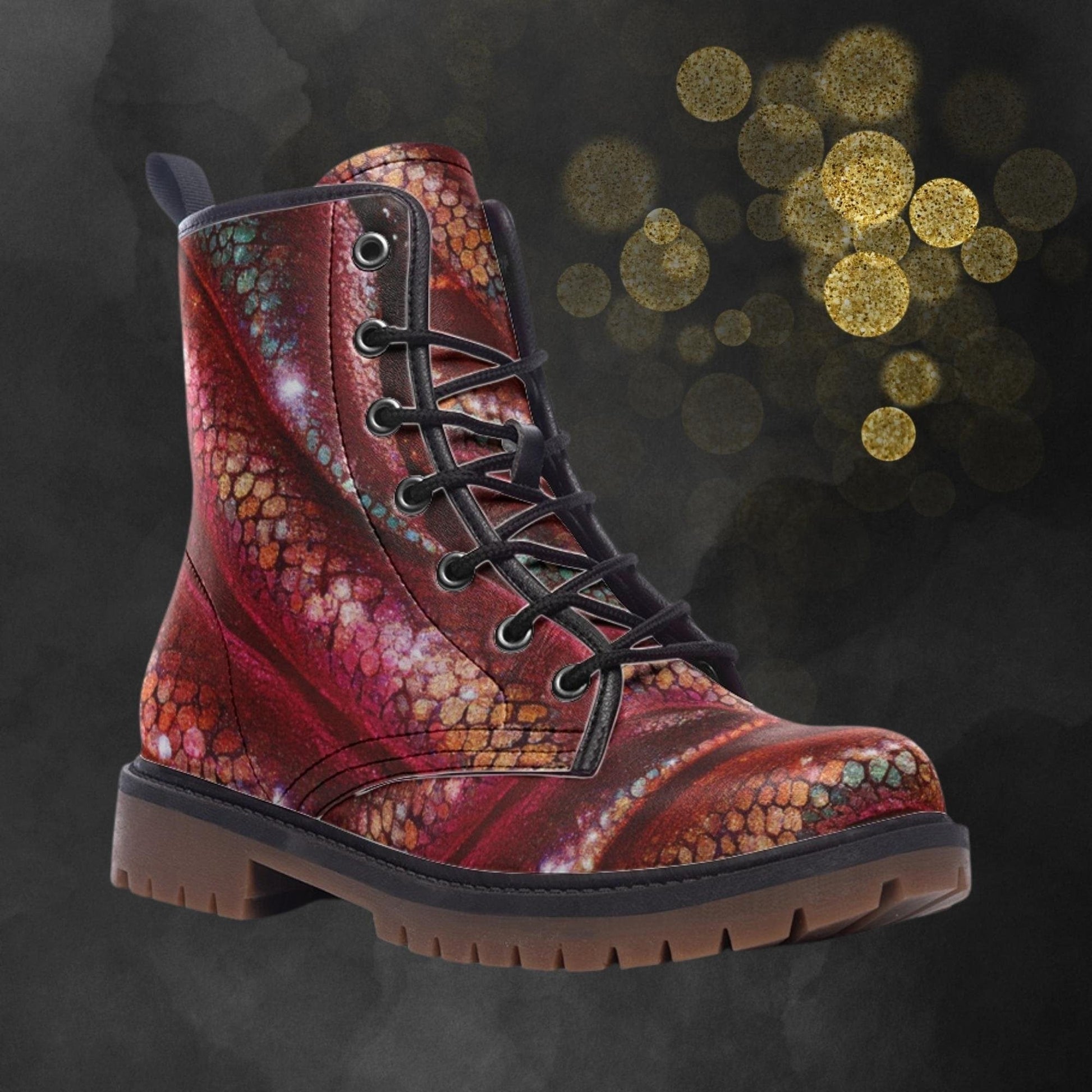 Make a bold statement with our Red and Yellow Dragonhide Combat Boots, crafted from durable vegan materials. These shoes feature a striking dragonhide pattern in vibrant red and yellow, evoking a sense of mythical strength and adventure. Perfect for those who appreciate both rugged style and ethical choices, they offer durability and a confident, fantasy-inspired flair. Take on any journey with these boots that combine imagination with sustainable craftsmanship.