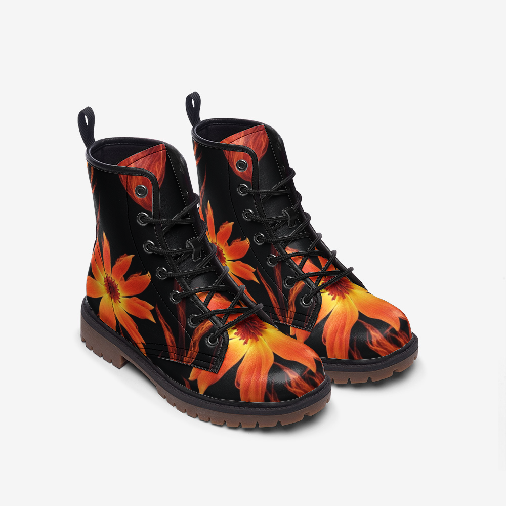 Enter a world of playful glamor with our Burnt Flowers Lightweight Leather Boots, designed by Emerald Blossoms. These boots feature vibrant and whimsical images of burning flowers, exquisitely detailed on high-quality leather. Perfect for free-spirited hippies, each pair embodies a blend of artistic expression and comfort. Show off your unique style and love of nature with boots that bring joy and creativity to every step.