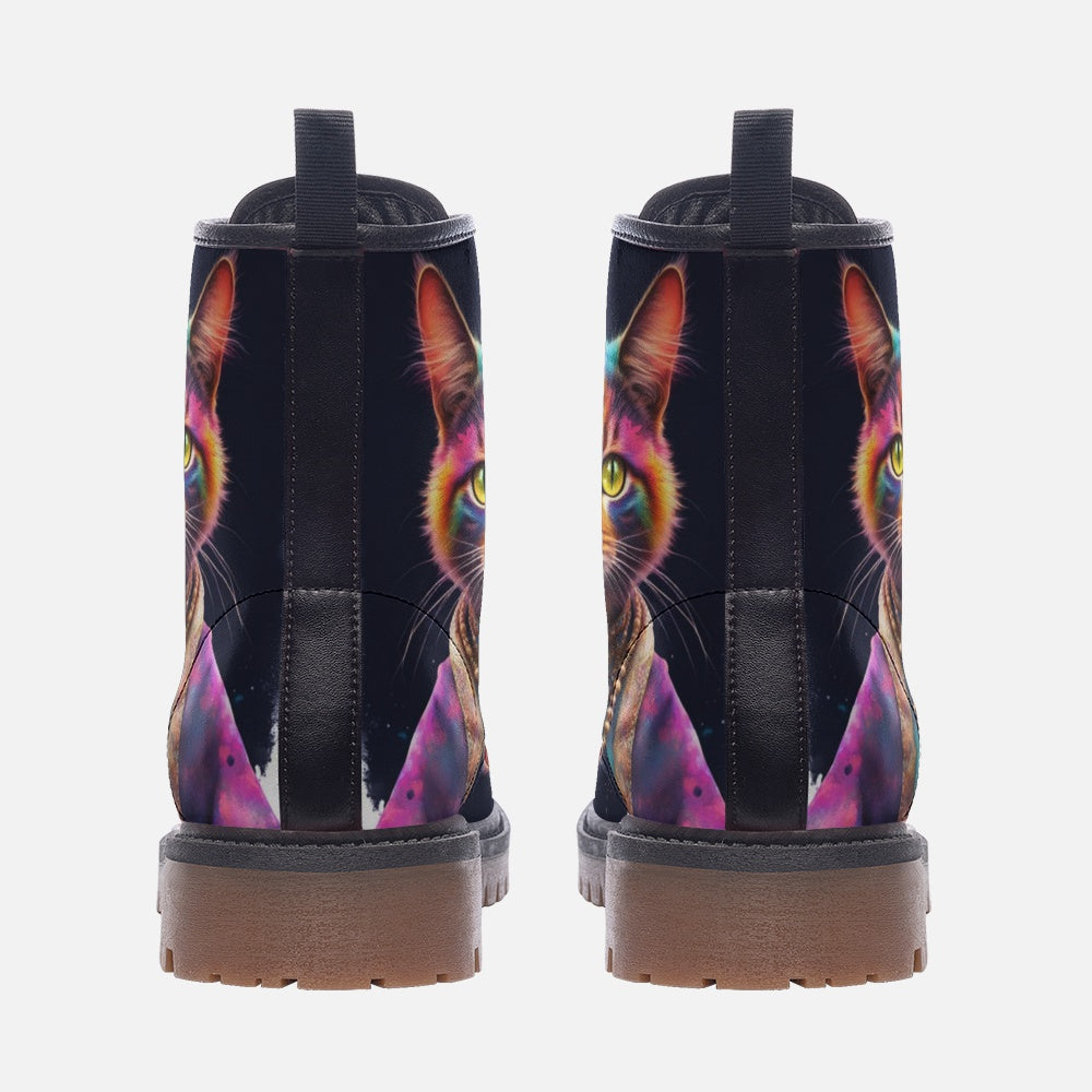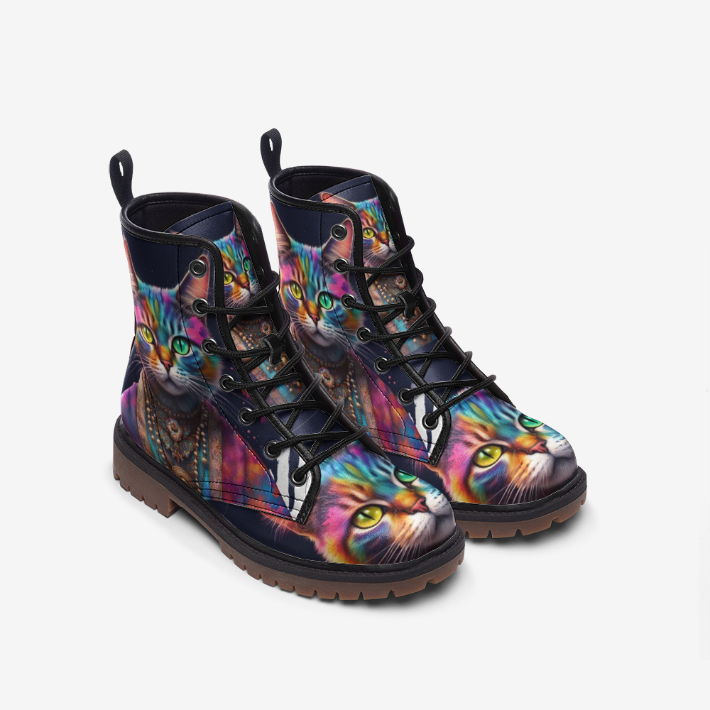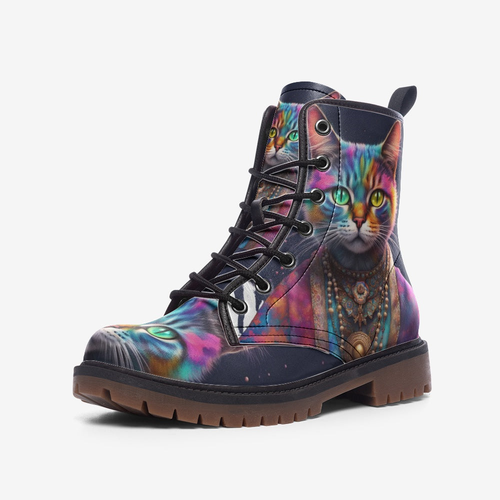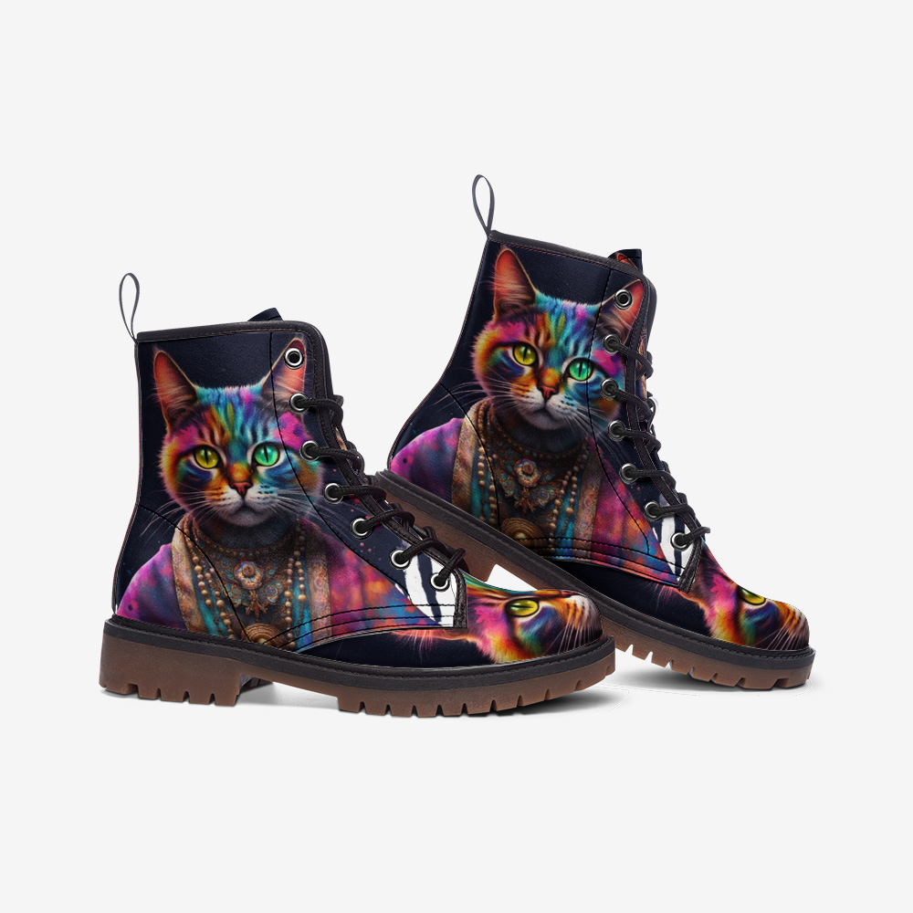 Cool Cat, Psychedelic Art, Animal Inspired Design Leather Lightweight Boots for Hippies