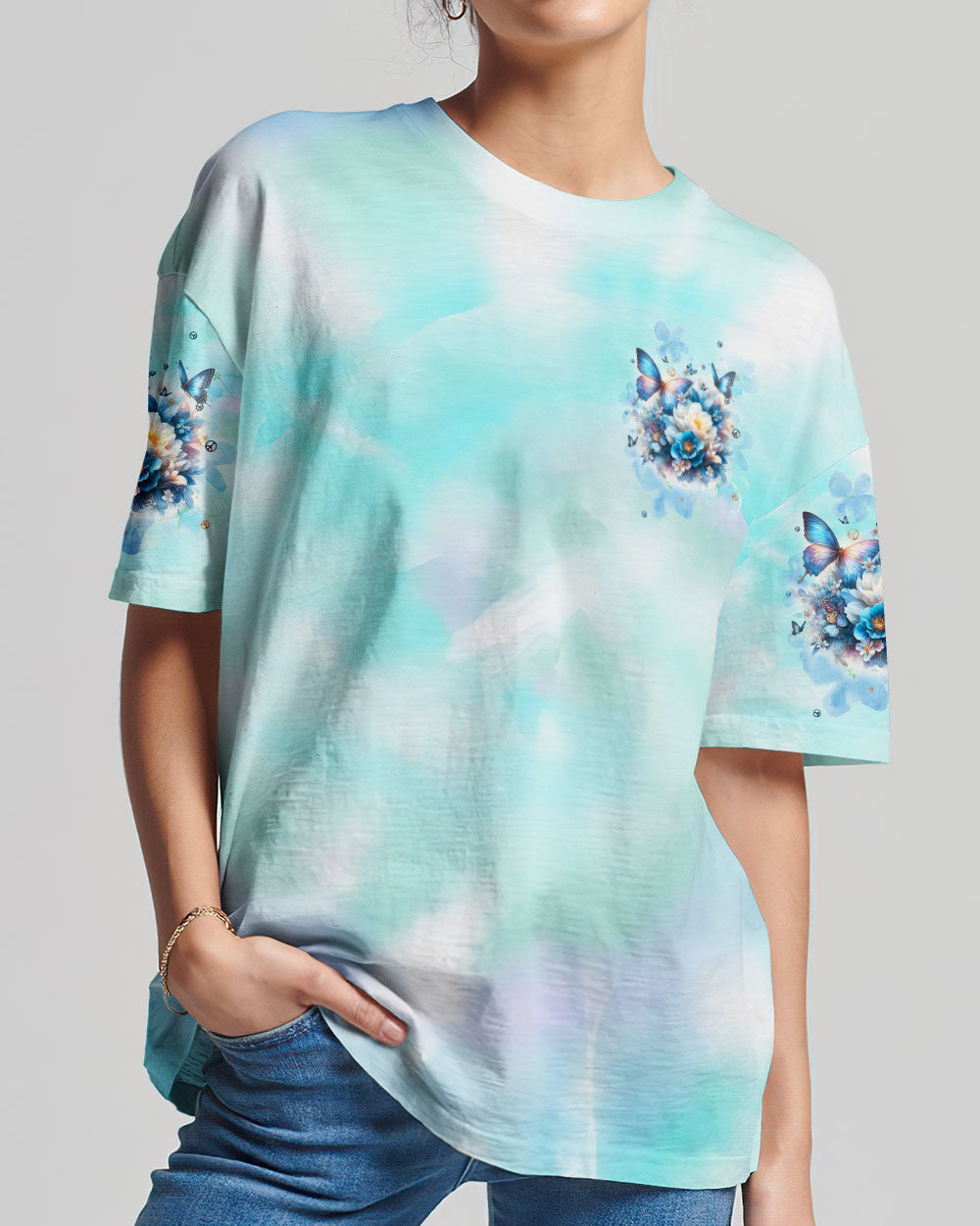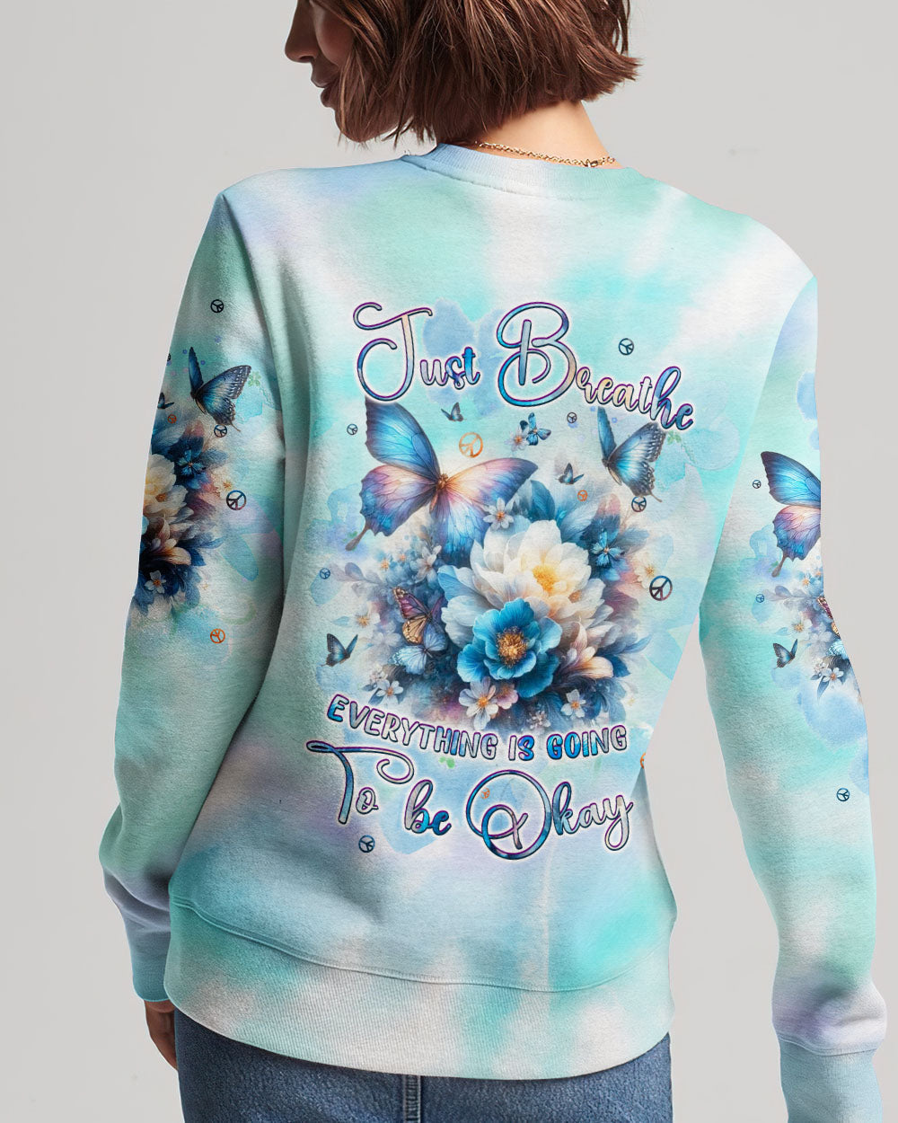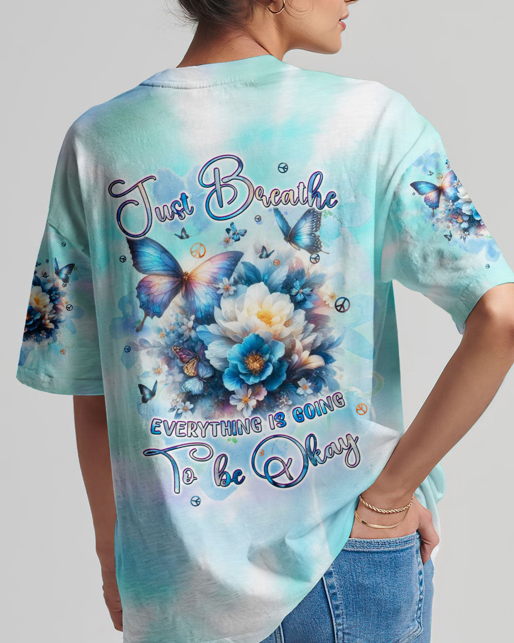 The all-over print "Just Breathe Butterfly" features a gentle message combined with a beautiful butterfly design. Perfect for those who love nature and mindfulness, this print encourages a moment of peace in a busy day. Crafted from a soft, lightweight fabric, it offers comfort and style, ideal for everyday wear. The serene design brings a touch of serenity to your wardrobe.