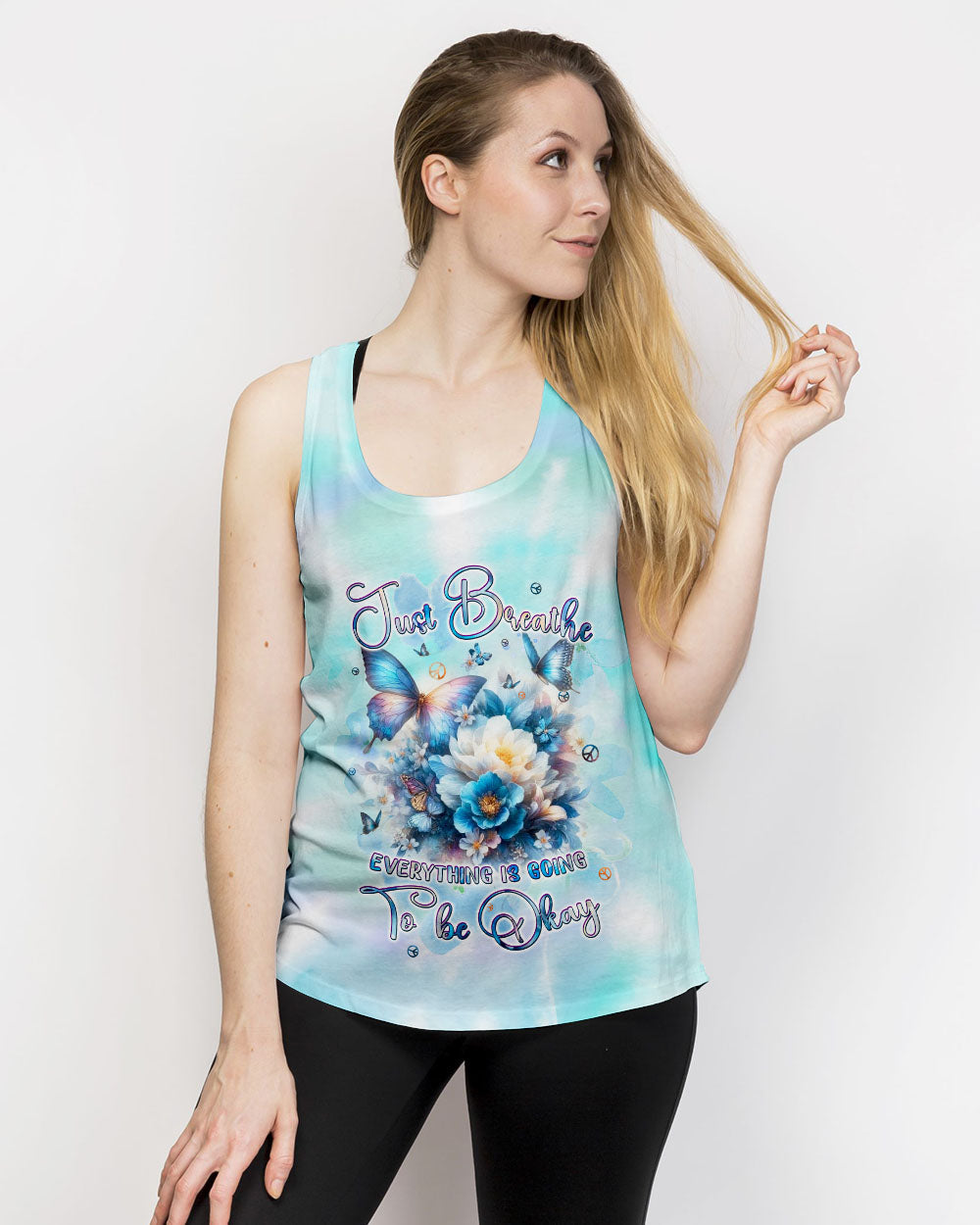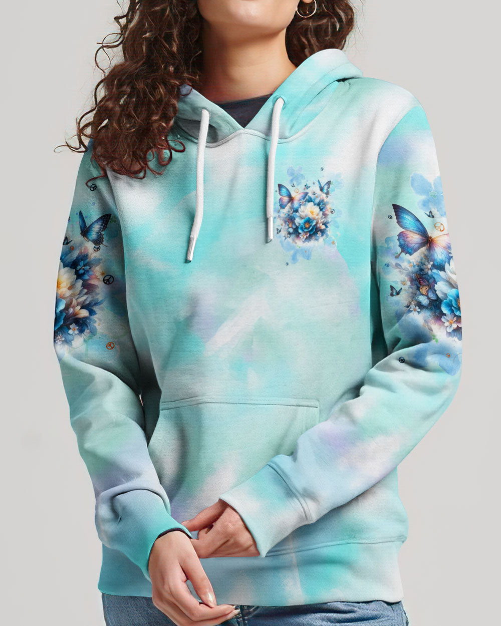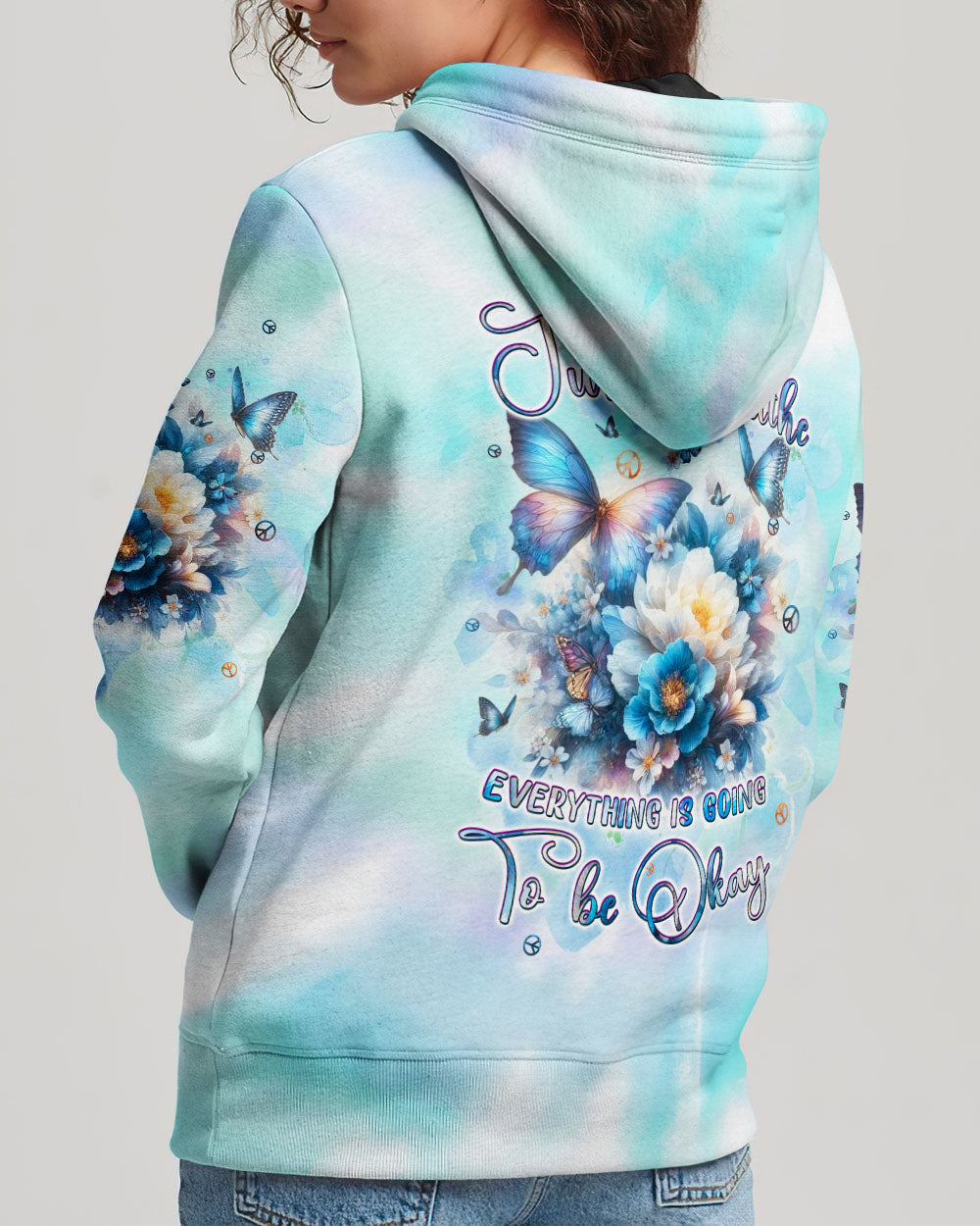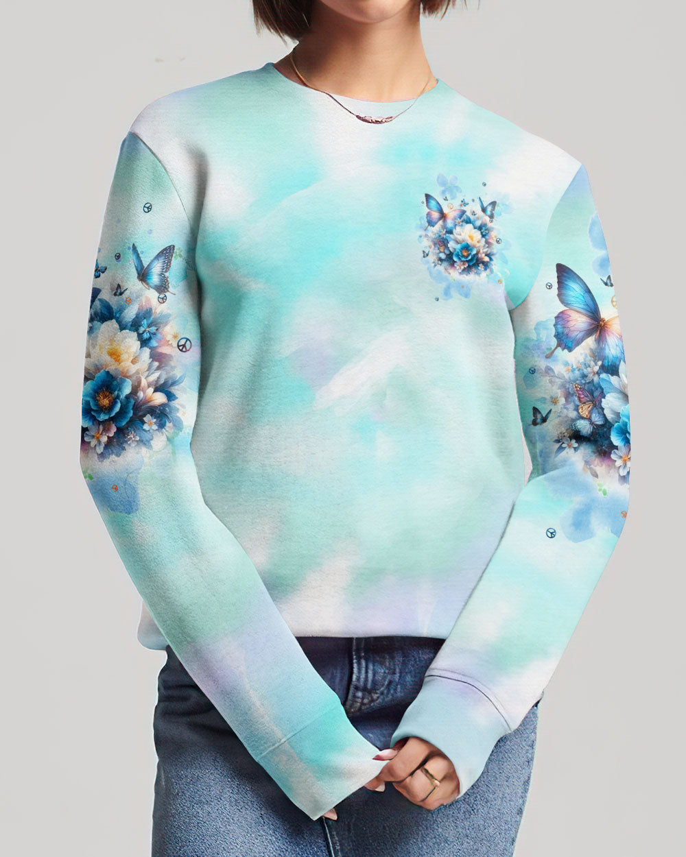 The all-over print "Just Breathe Butterfly" features a gentle message combined with a beautiful butterfly design. Perfect for those who love nature and mindfulness, this print encourages a moment of peace in a busy day. Crafted from a soft, lightweight fabric, it offers comfort and style, ideal for everyday wear. The serene design brings a touch of serenity to your wardrobe.