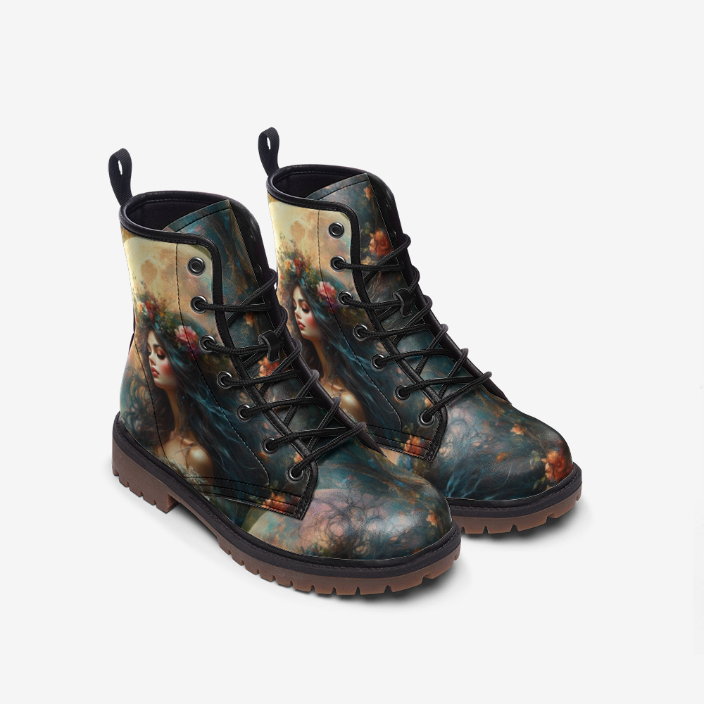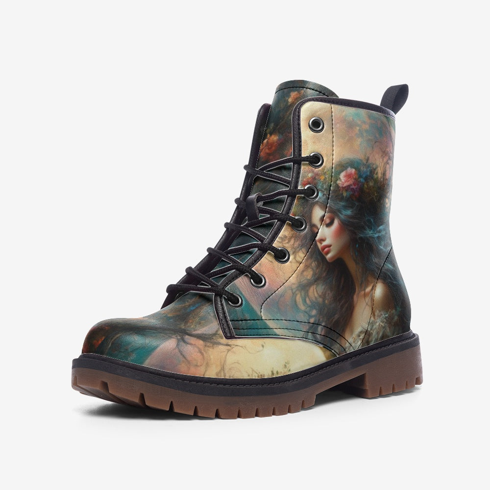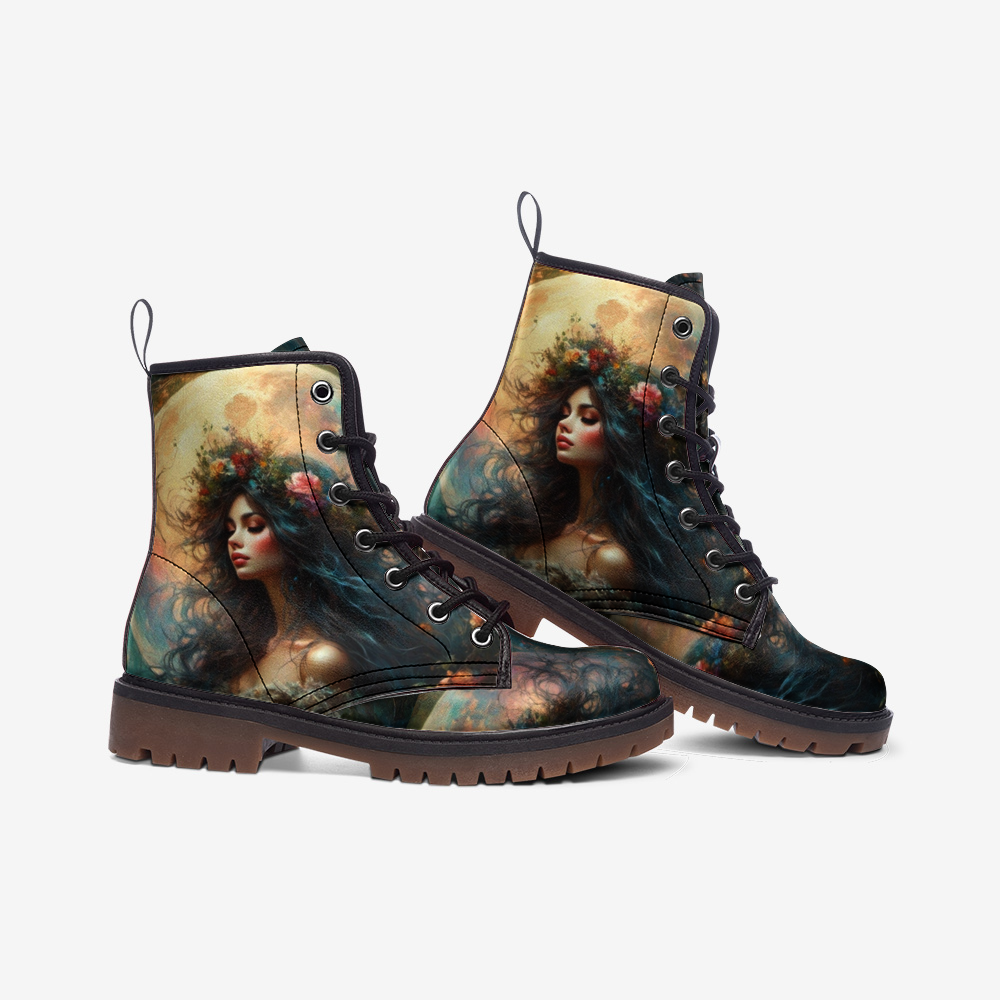 Embrace the beauty of the celestial world with our Moonlit Maiden vegan leather boots. Featuring a captivating design of a mystical maiden under the glowing moonlight, these boots are perfect for hippies and those drawn to the magic of the night. Crafted from eco-friendly vegan leather, they are both stylish and sustainable. Step into the magical world of the moon, combining comfort, durability and a touch of witchy charm for your unique adventures.
