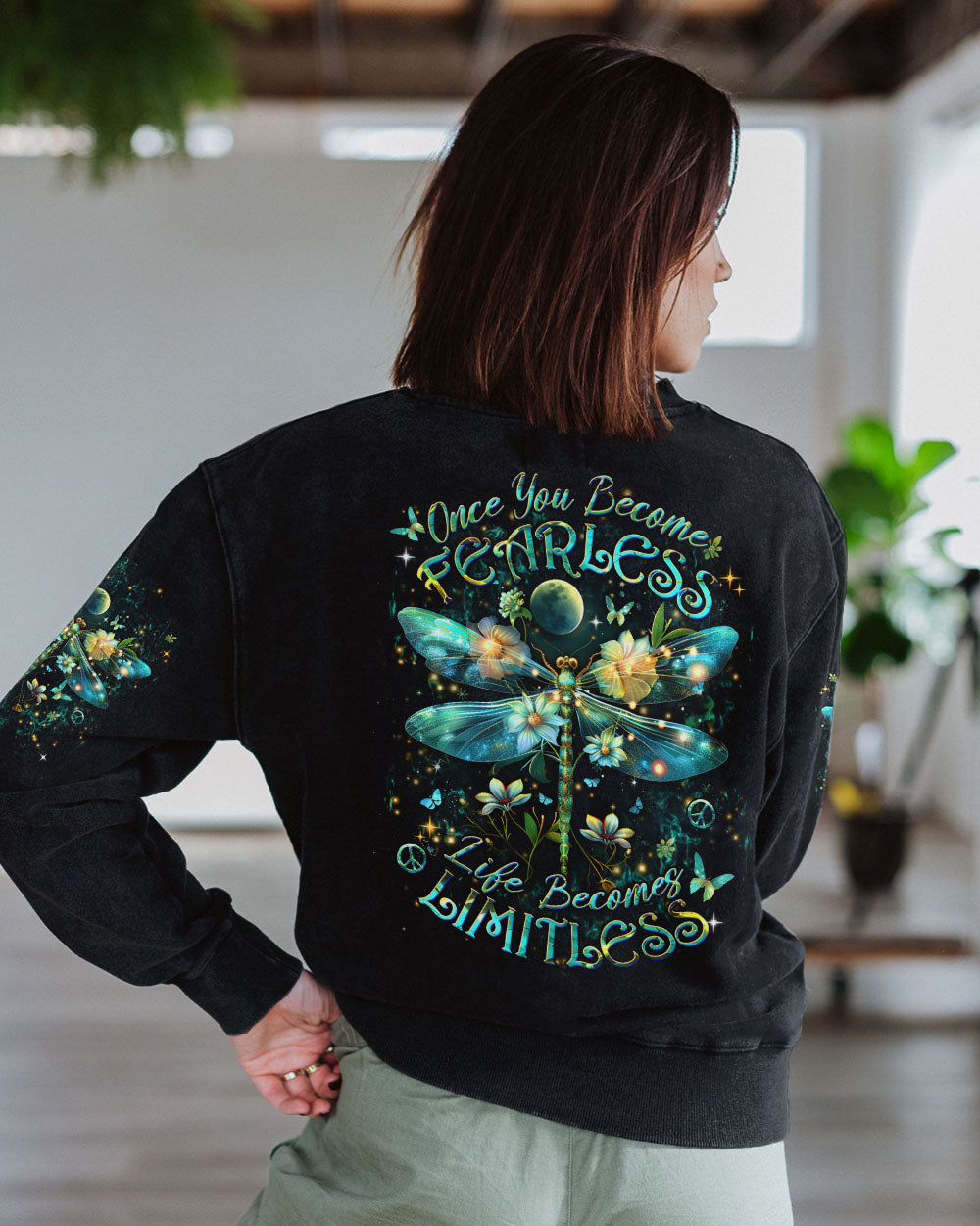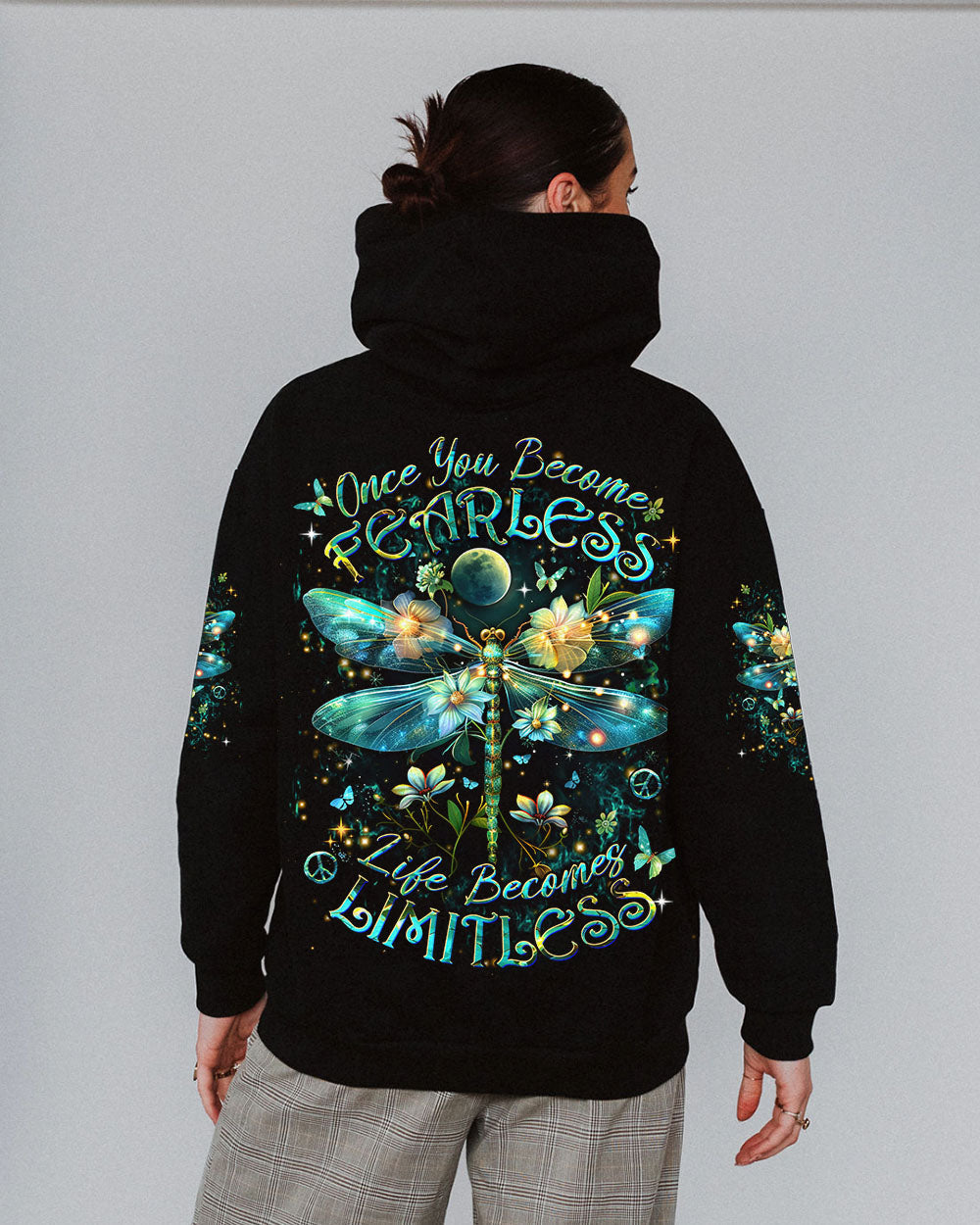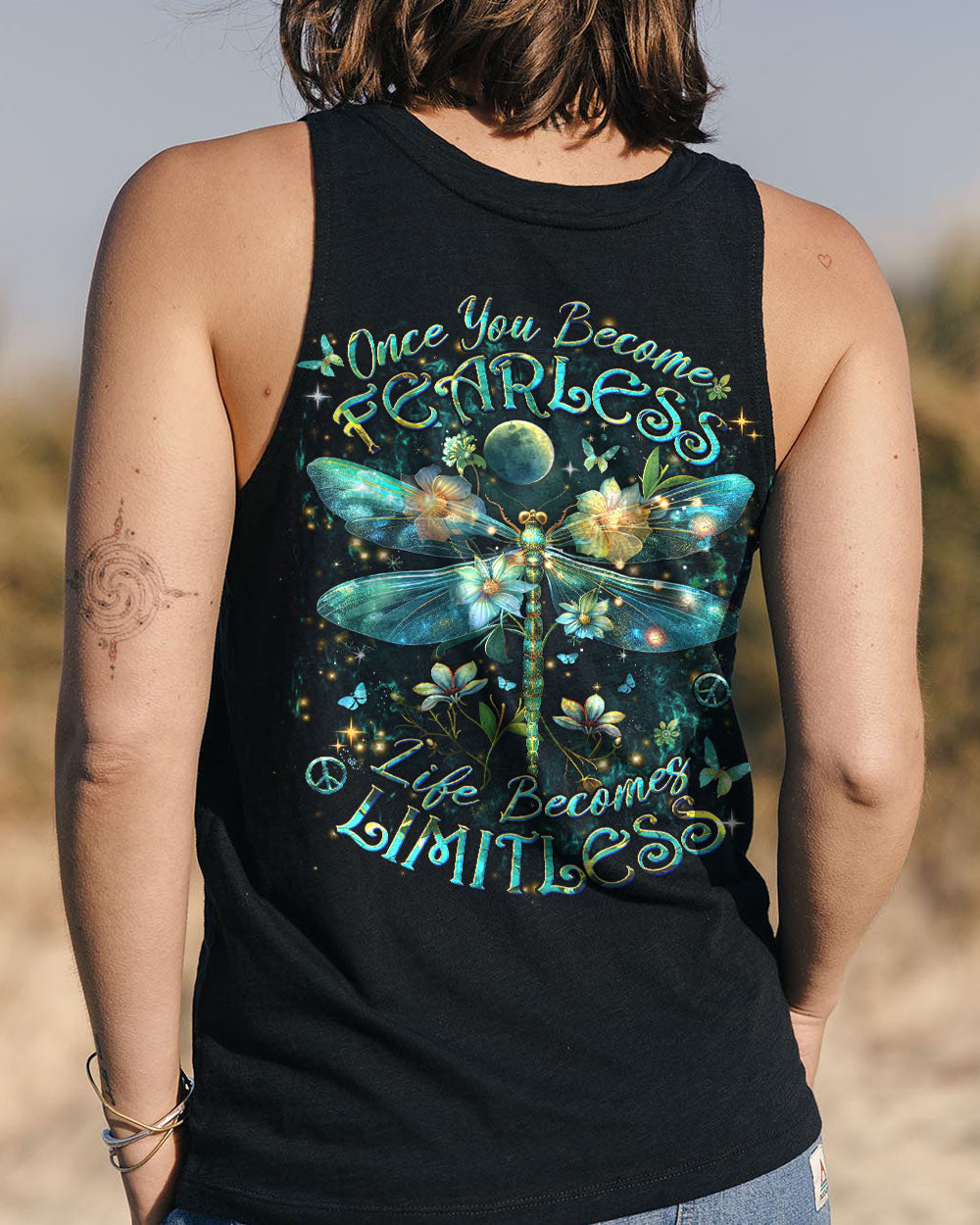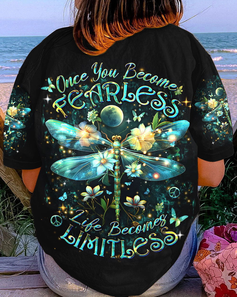 The all-over print "Once You Become Fearless Dragonfly" features an inspirational message combined with a beautiful dragonfly design. The print represents courage and transformation, perfect for those who are always striving to overcome challenges. Made from a soft, lightweight fabric, it's ideal for everyday wear. The vibrant design serves as a reminder to embrace courage and live boldly, adding a unique touch to your wardrobe.