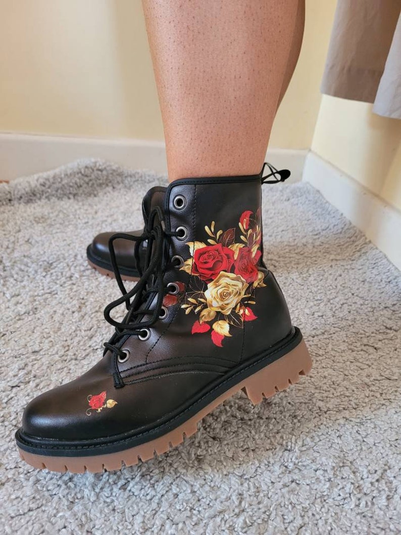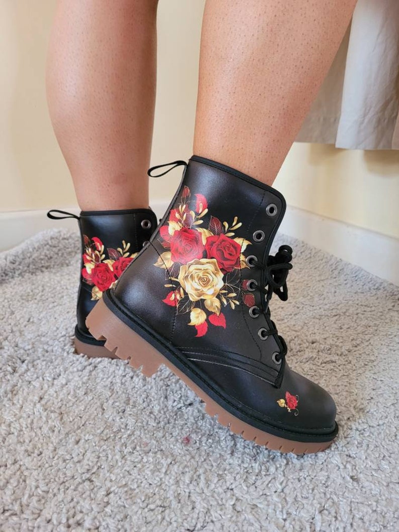 Showcase your bold style with Rose Boots! Featuring lifelike rose patterns on durable vegan leather, these combat boots blend beauty with eco-consciousness. Lightweight and comfortable, theyâ??re perfect for any outfit or occasion. ð??¹