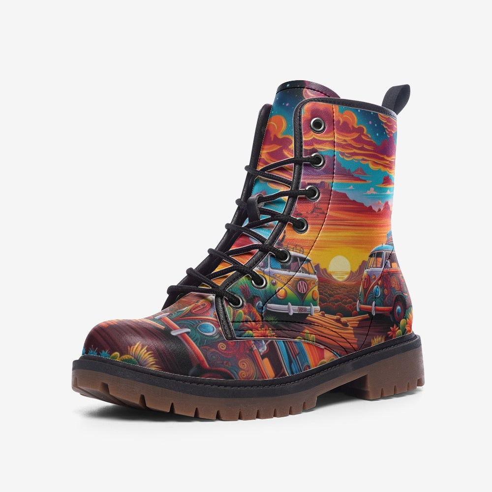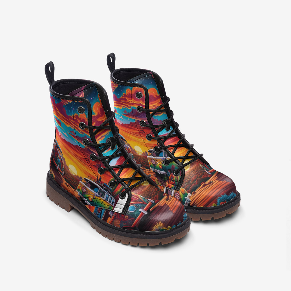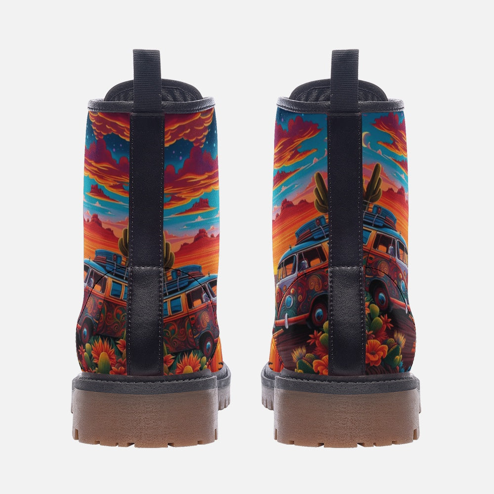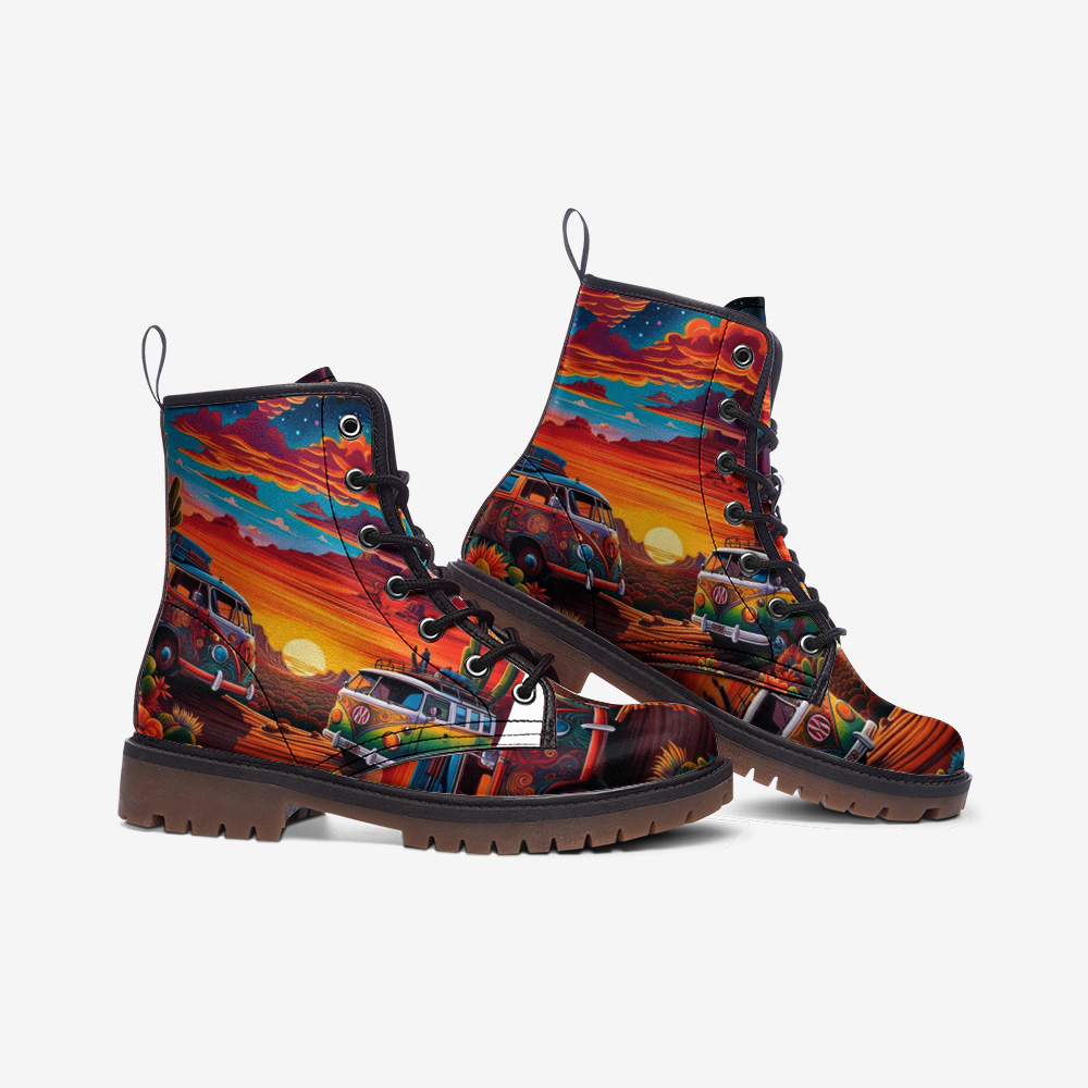 Embark on your next adventure with the Sunset On The Way Boots. Featuring a stunning sunset design, these casual leather boots evoke the spirit of kombi rides and the freedom of the road. Lightweight and designed for comfort, they are perfect for hippies who love sunsets and spontaneous road trips. Show off your wanderlust and let your style shine as you hit the road in these glamorous boots.