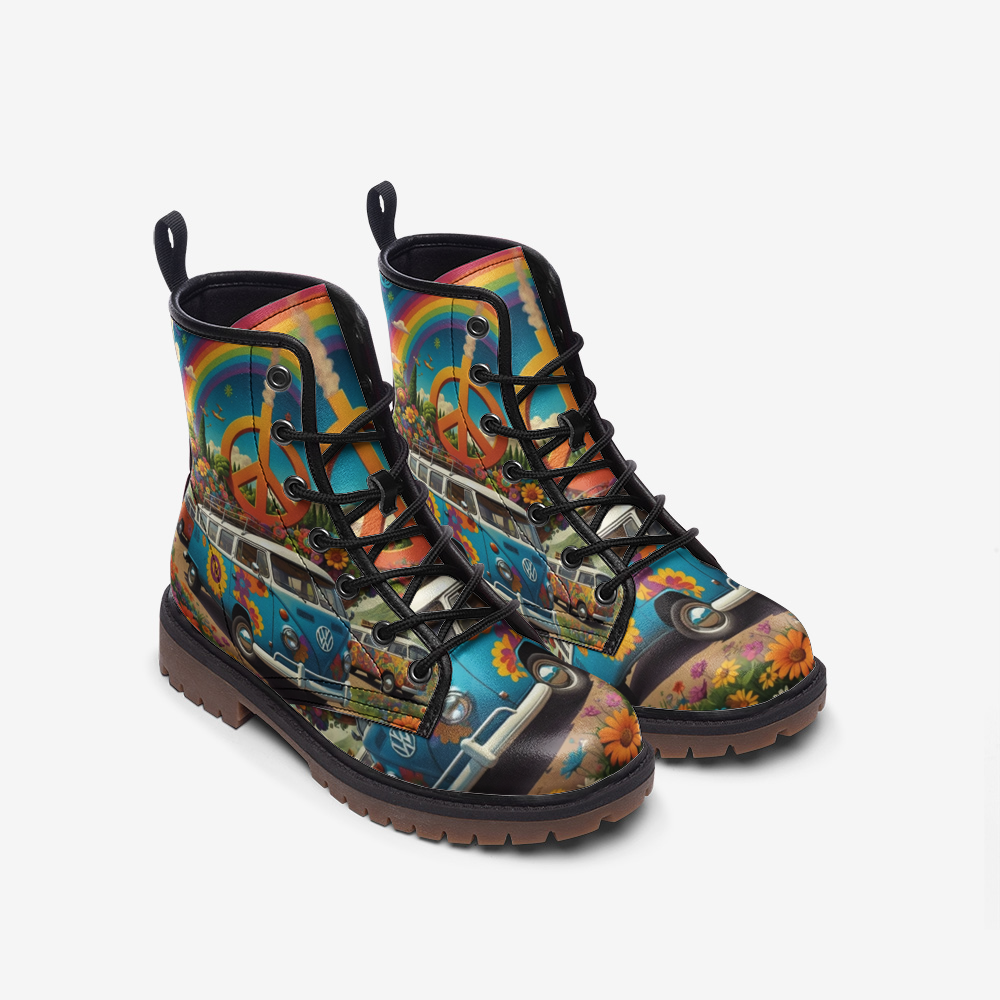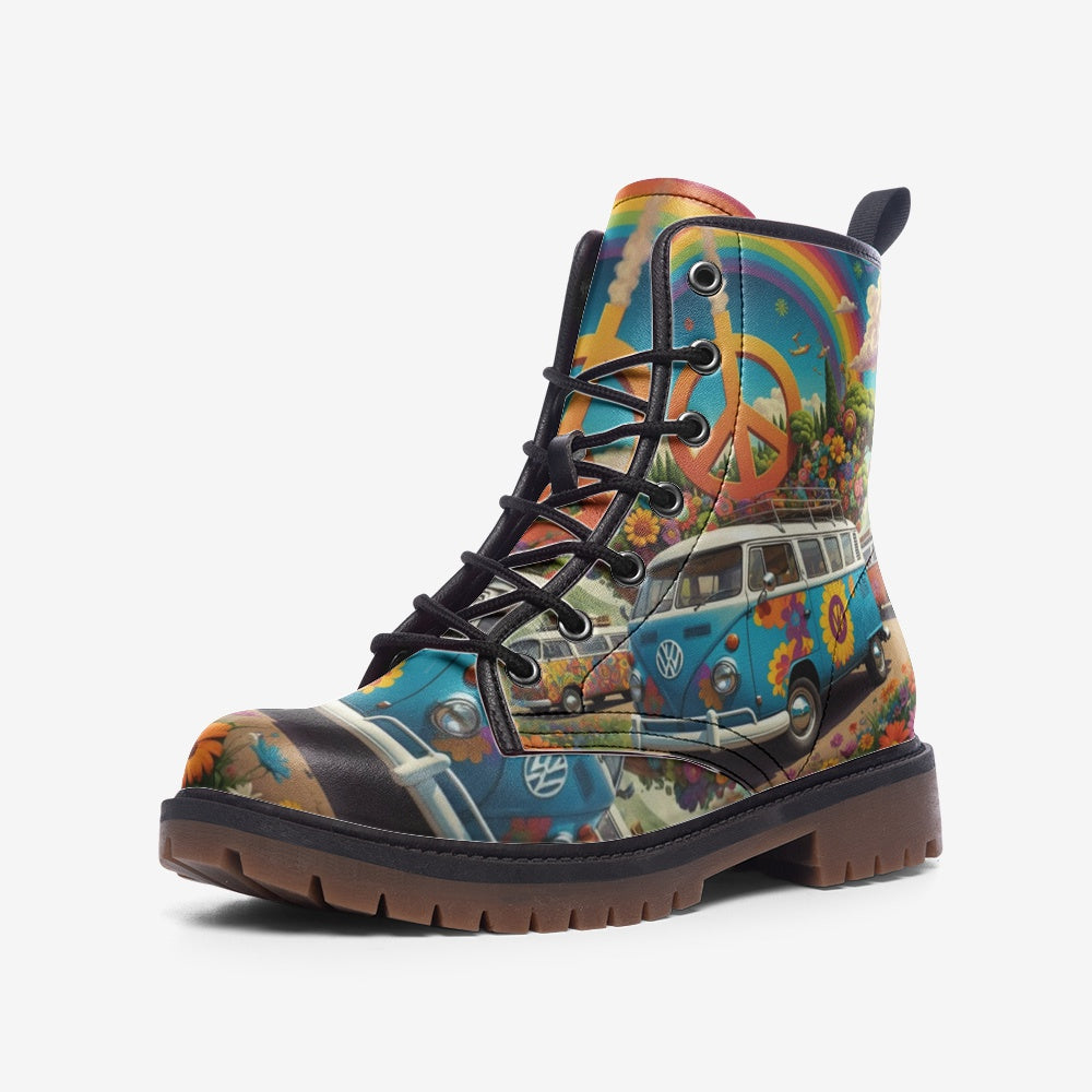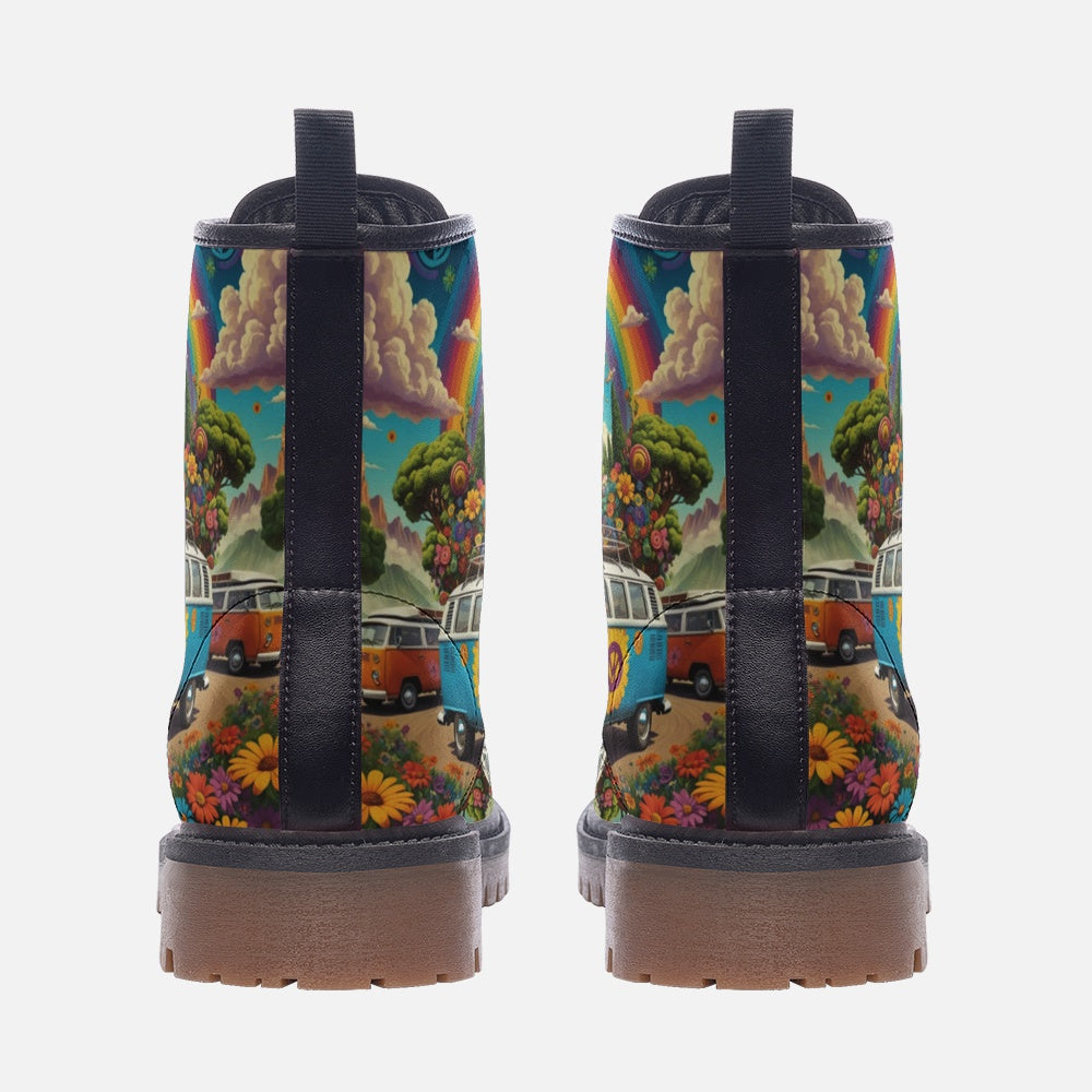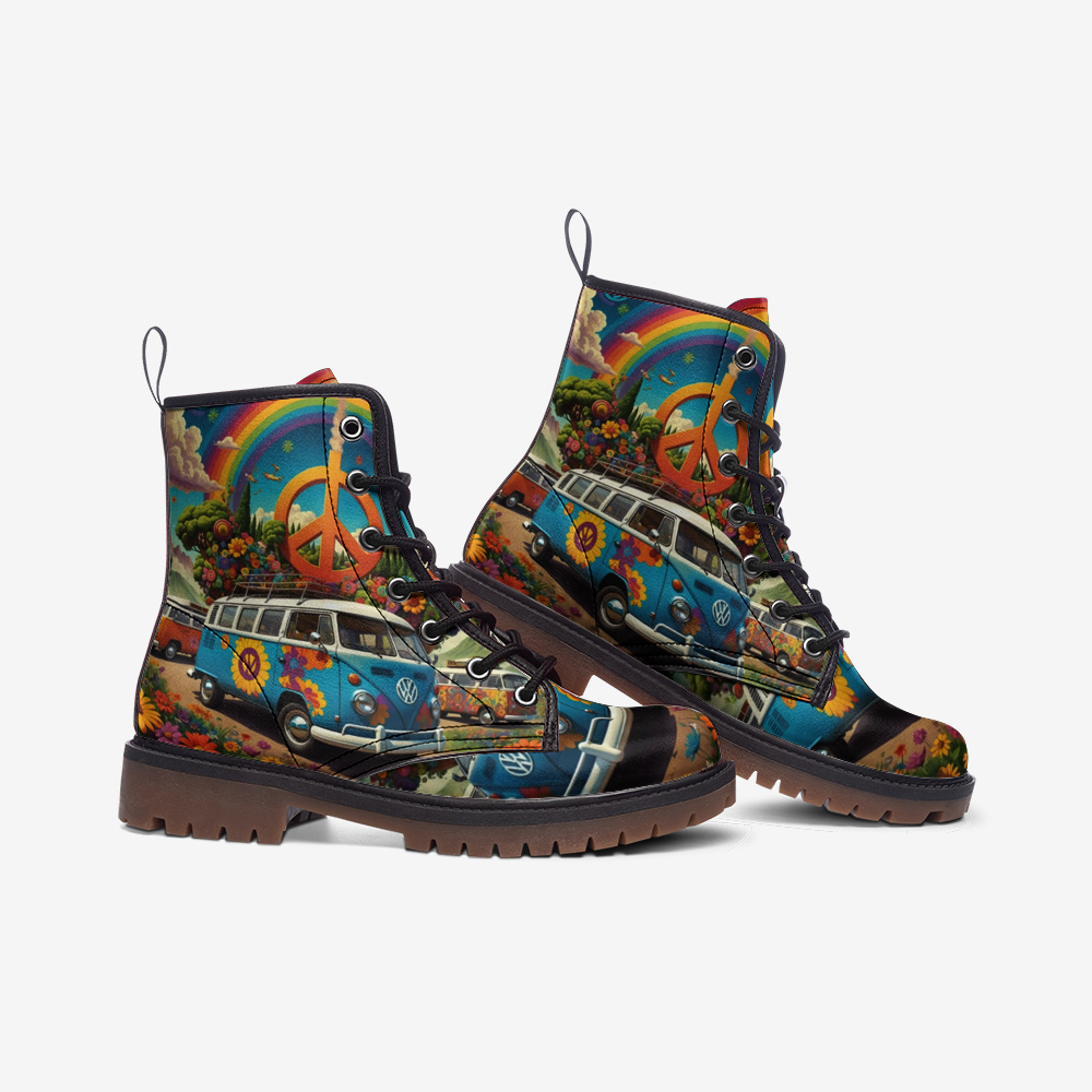Hippie Art Zone - Volkswagen Van To Hippie Destination Casual Leather Lightweight Boots For Hippies