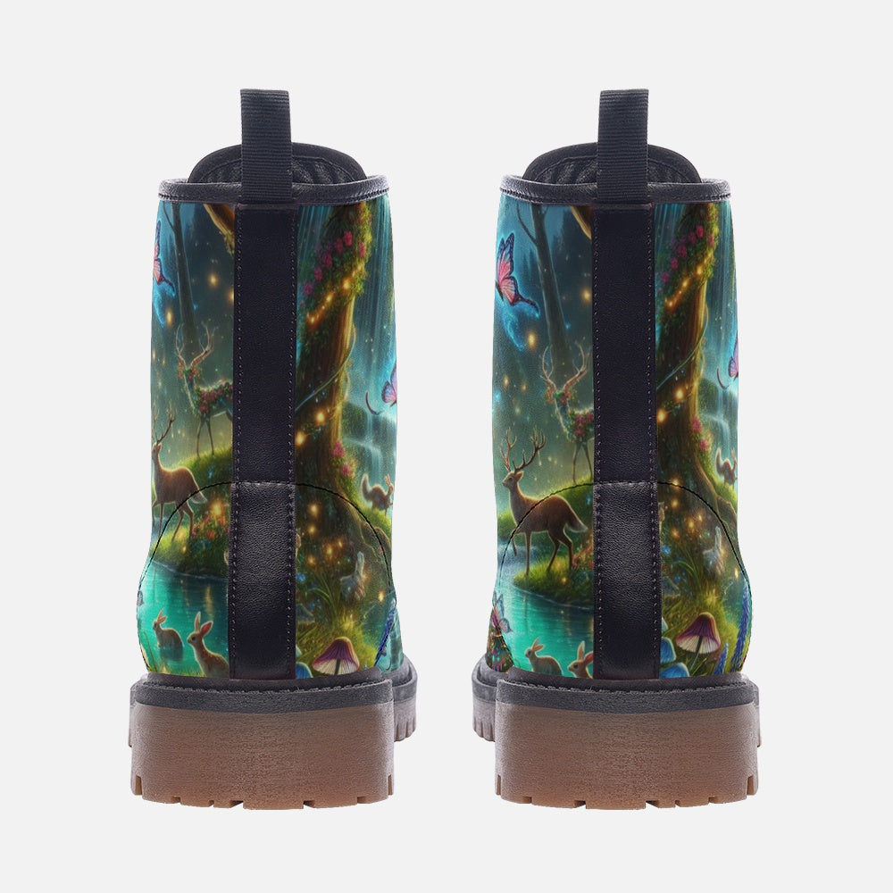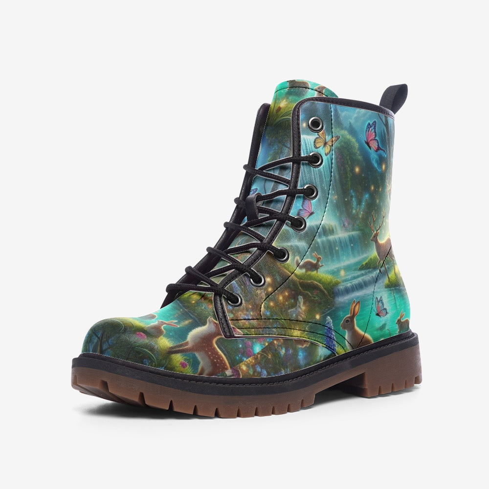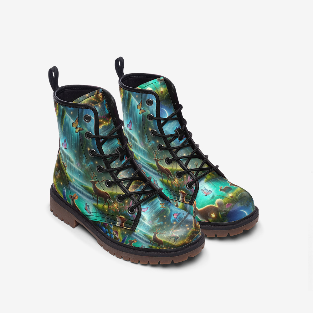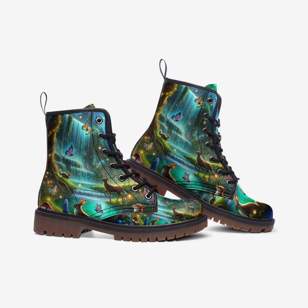 Immerse yourself in the wonders of nature with our Waterfall Forest vegan leather boots. This design recreates a serene forest scene with wildlife living in harmony beneath a cascading waterfall. Perfect for nature lovers and free spirited individuals, these boots are crafted from eco-friendly vegan leather, offering a combination of sustainability and style. Let every step take you deeper into the beauty of the wilderness with comfort and adventure at your feet.