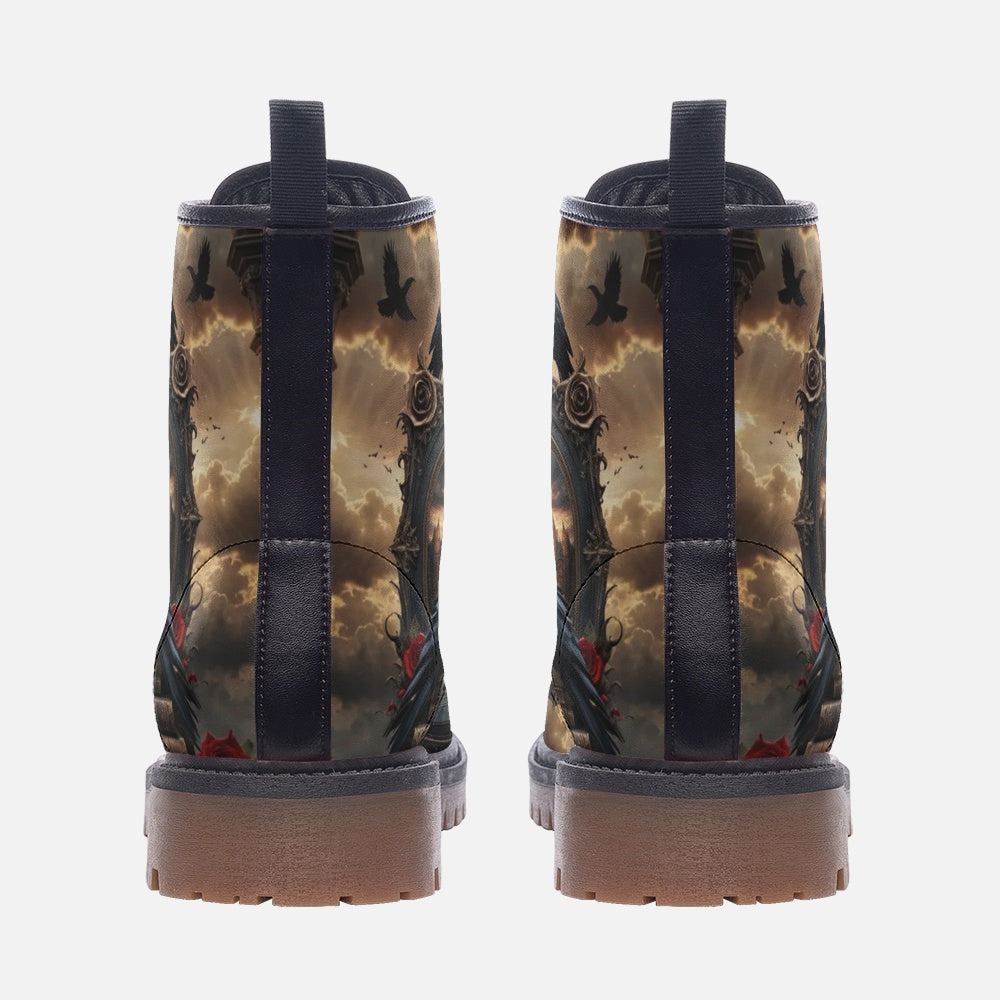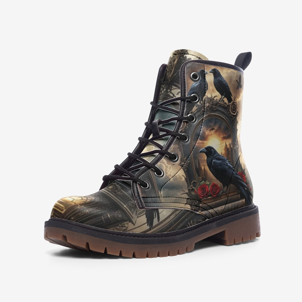 Step into the world of the mystical with our Witchy Raven & Rose Vegan Leather Combat Boots. Perfect for both the free-spirited and the gothic, these boots feature a haunting raven surrounded by alluring roses. Crafted from eco-friendly vegan leather, theyâ??re as kind to the earth as they are to your style. Add a touch of witchy charm to your wardrobe while remaining comfortable and durable for all your adventures.