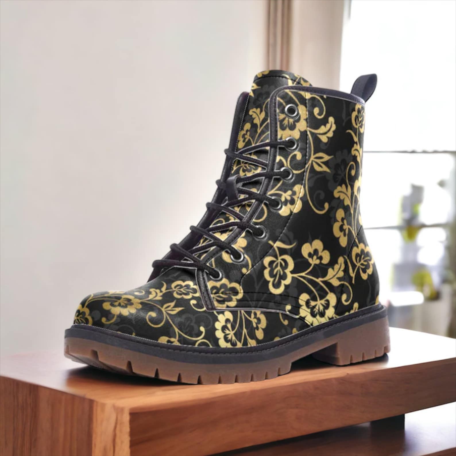 Hippie Art Zone - Black and Faux Gold Floral Vegan Combat Boots.