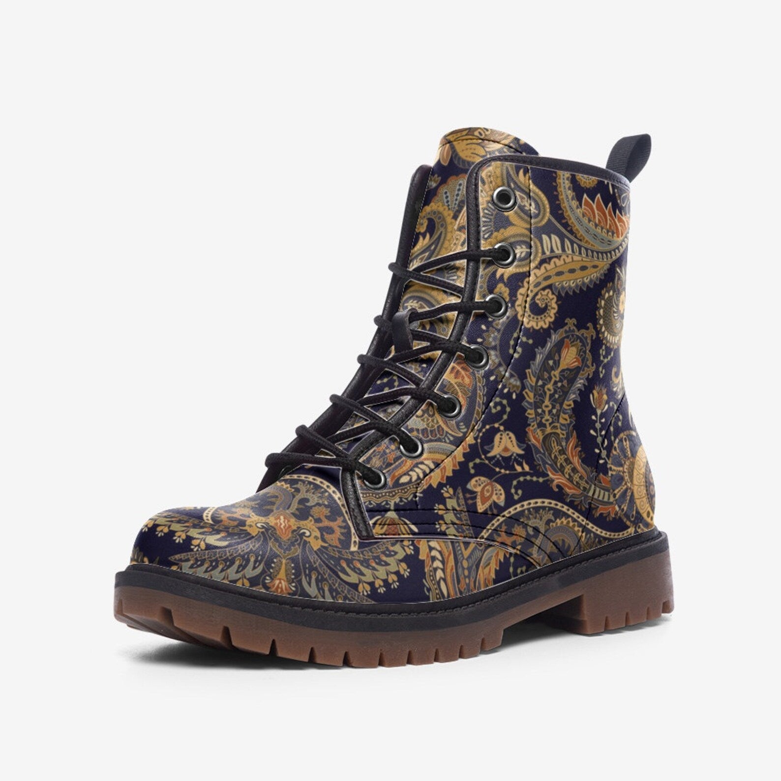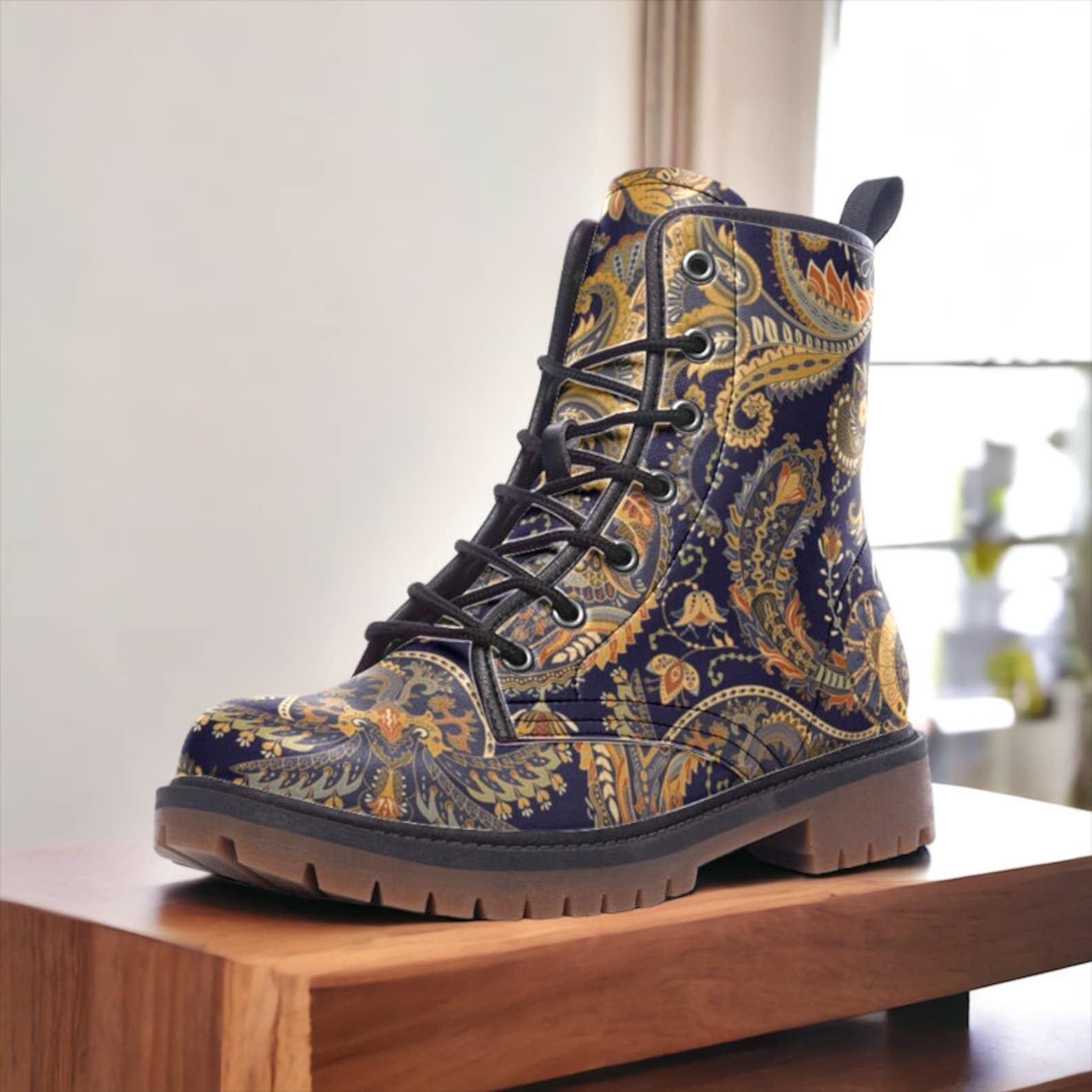 Get ready to hit the festival grounds in style with the hippieartzone Boots in a stunning dark blue floral print. These vegan boots are perfect for eco-conscious hippies who want to make a statement while still being kind to animals. The bold floral pattern adds a fun and whimsical touch to any outfit, while the sturdy construction ensures you can dance the night away in comfort. Pair these boots with some leg wraps for a complete boho look that will have you standing out from the crowd. Embrace your inner hippie spirit and add these unique boots to your festival wardrobe today!
