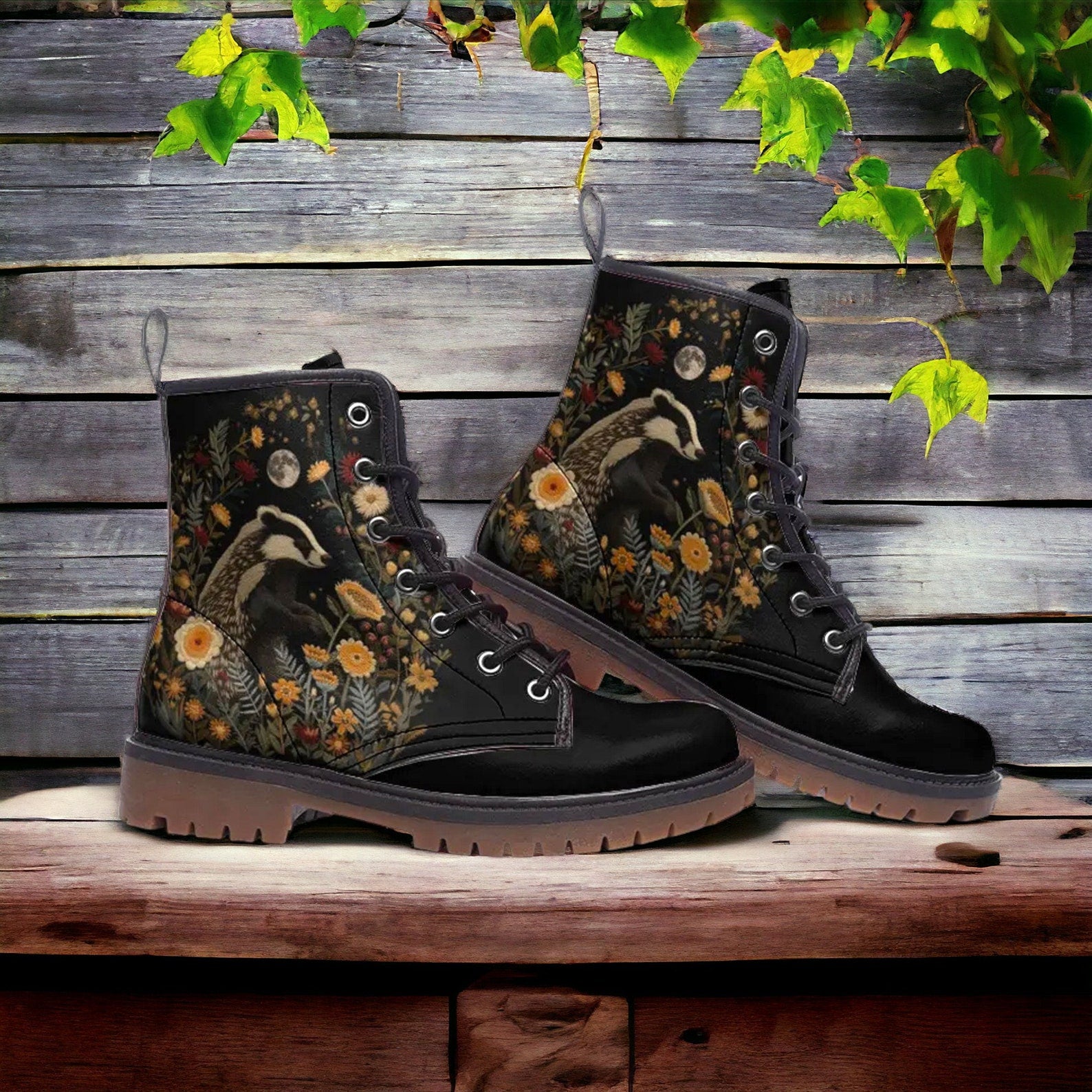Hippie Art Zone - Faux-embroidery Badger & Moon Vegan Boots.