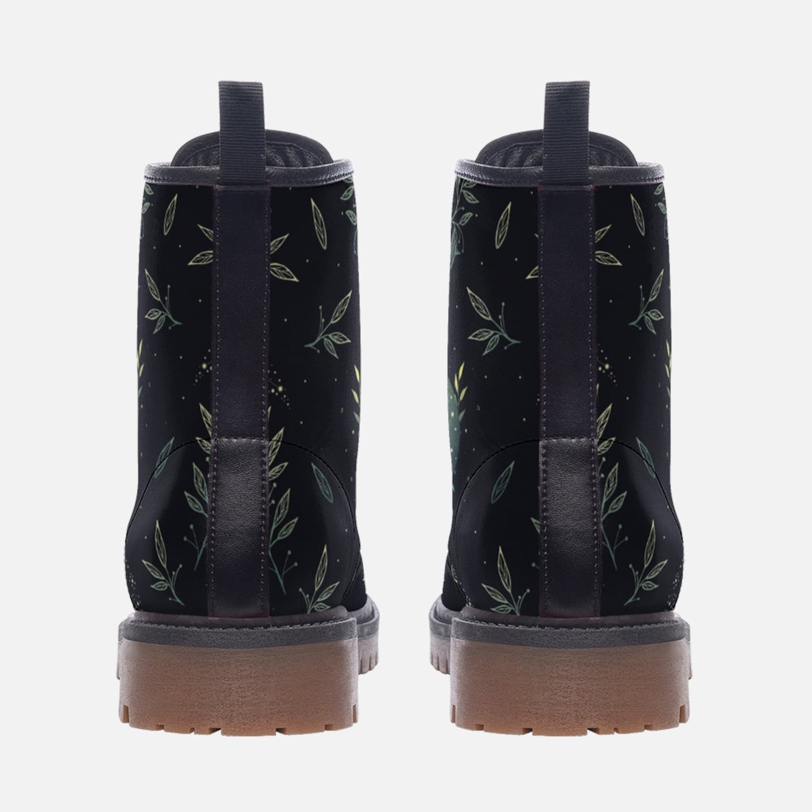 Forest Witch Moon Vegan Leather Combat Boots exude mystery with their moon motifs and the wildness of nature. Crafted from durable vegan leather, these boots are both eco-friendly and comfortable. Featuring a bold combat design and a mystical style, these are the perfect choice for those who love freedom and magical beauty.