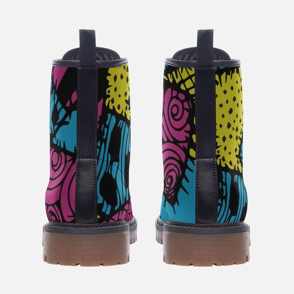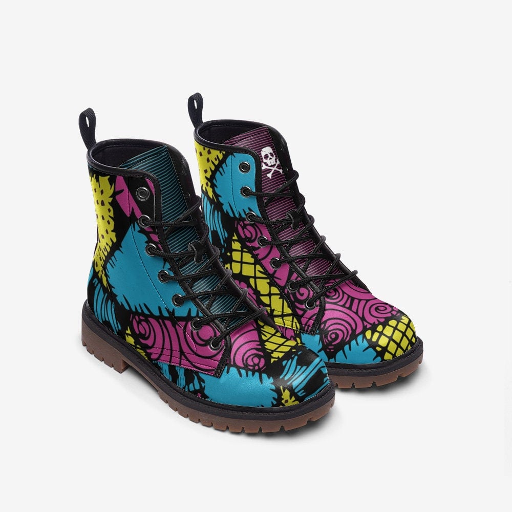 - Features vegan-friendly leather with a double-sided print and rounded toe construction