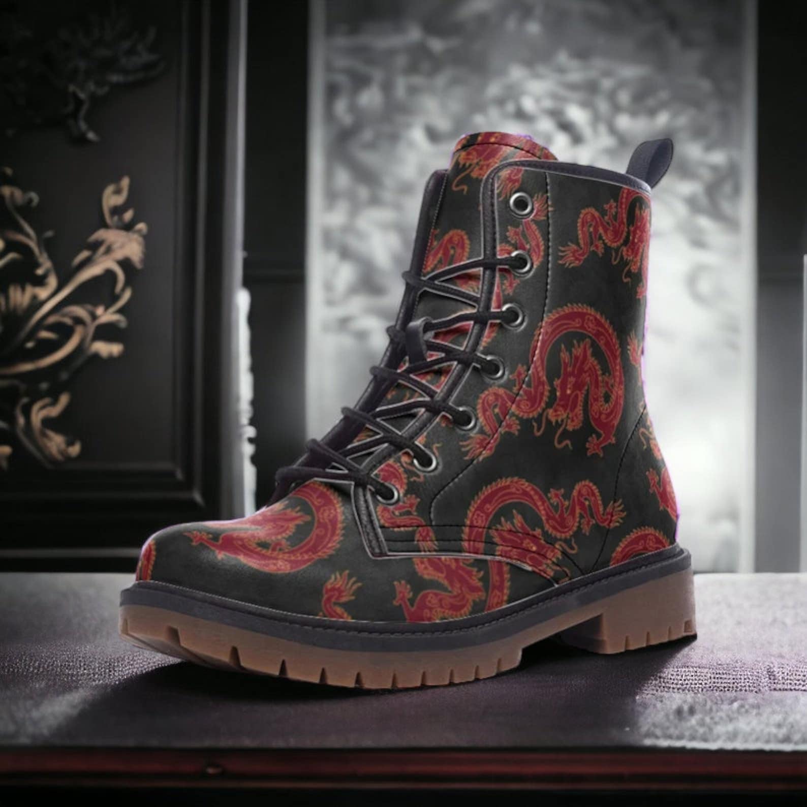 Step out in style with these hippieartzone Boots made from vegan leather. These combat boots feature a unique design with red Chinese dragons emblazoned on them, giving off a bold and eclectic look. These boots are perfect for hippies who love to stand out and make a statement with their fashion choices. With these hippieartzone Boots, you can add a touch of bohemian flair to any outfit and showcase your individuality. Made with high-quality materials, these boots are not only stylish but also durable and comfortable to wear. Stay true to your hippie roots with these eye-catching and one-of-a-kind boots.