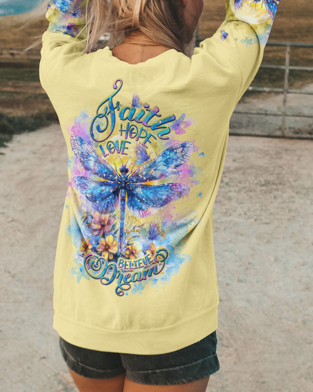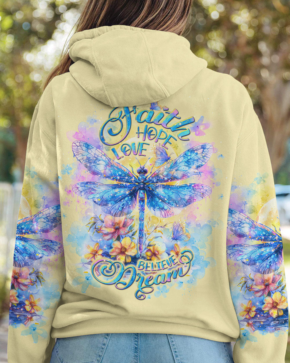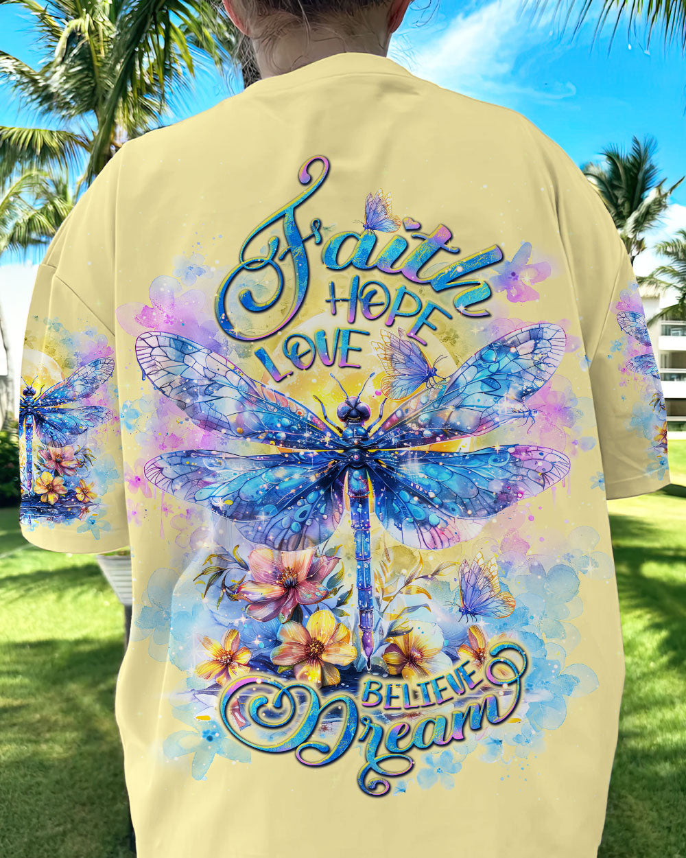The all-over print "Faith Hope Love Dragonfly" features a beautiful design that intertwines vibrant dragonflies with meaningful symbols of faith, hope and love. Perfect for those who value positivity and inspiration, this print encourages resilience and connection. Crafted from a soft, comfortable fabric, it's ideal for everyday wear. The uplifting imagery adds a heartfelt touch to your wardrobe, reminding you to embrace these values in your everyday life.