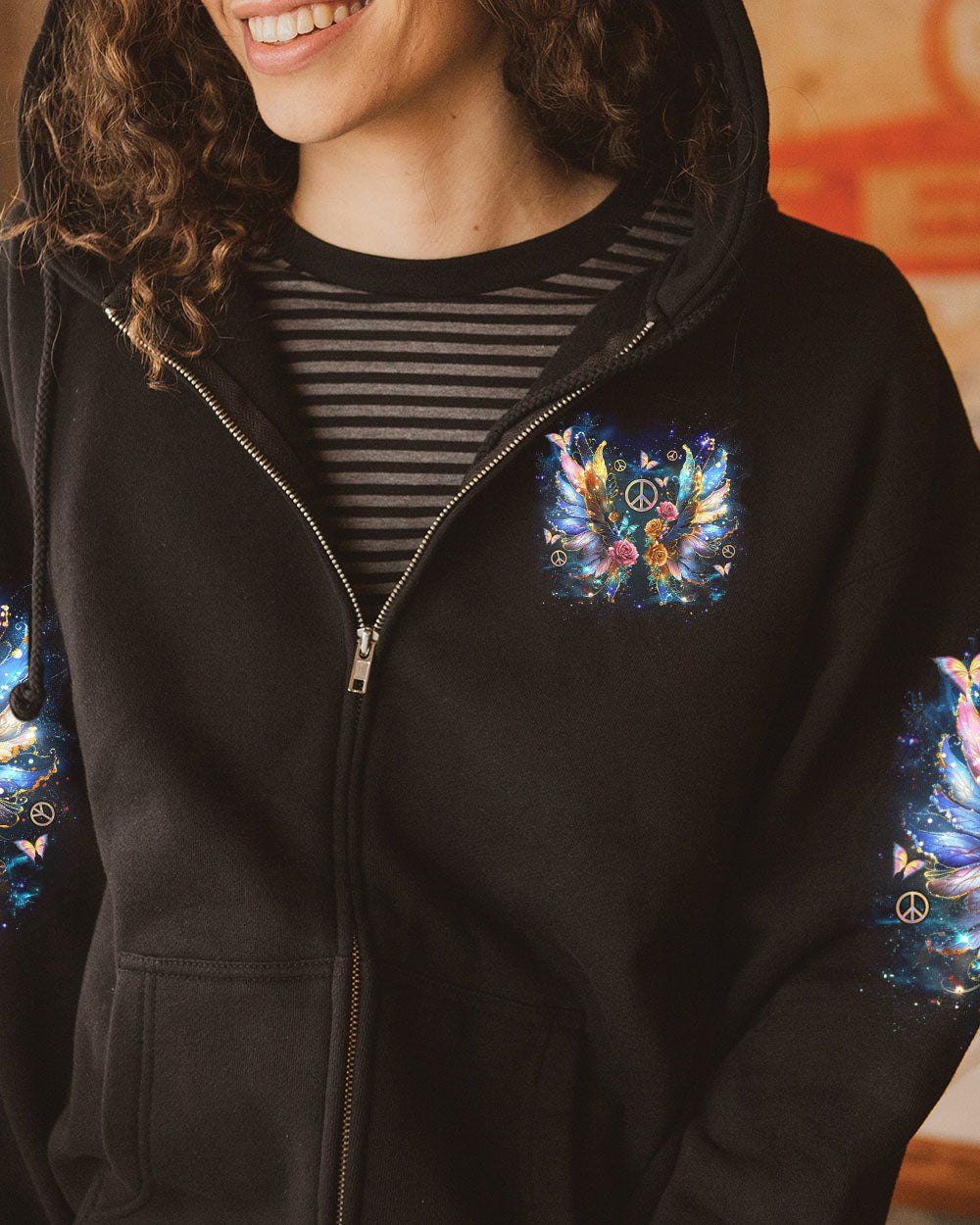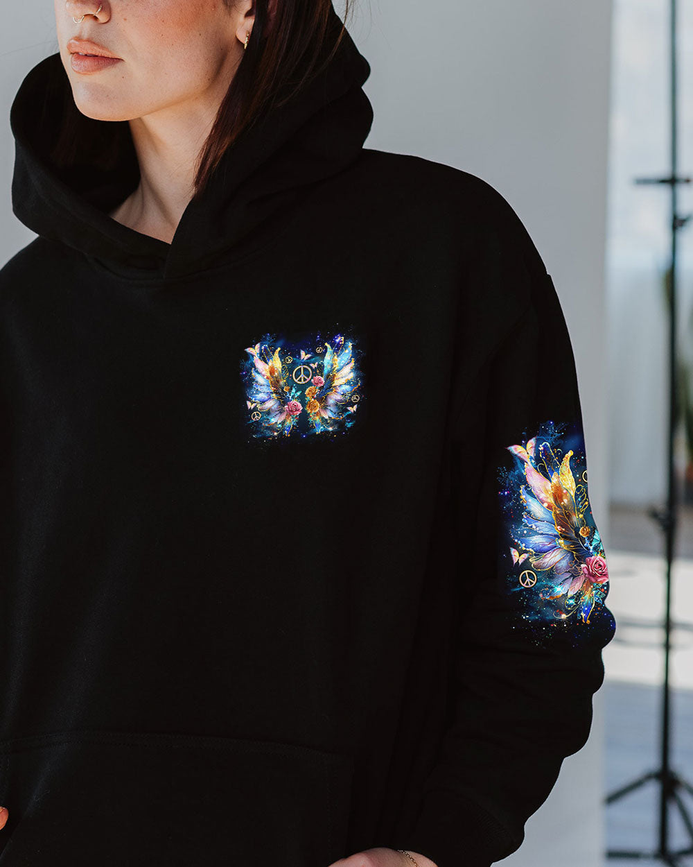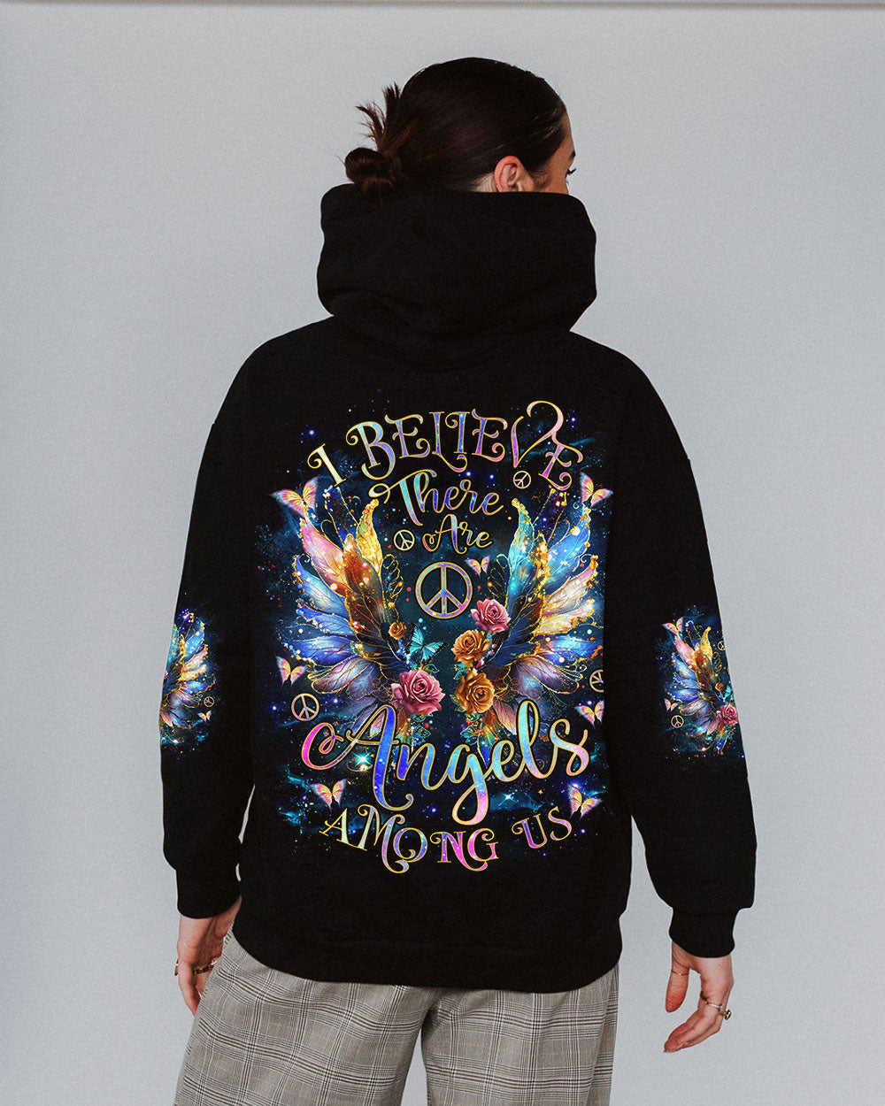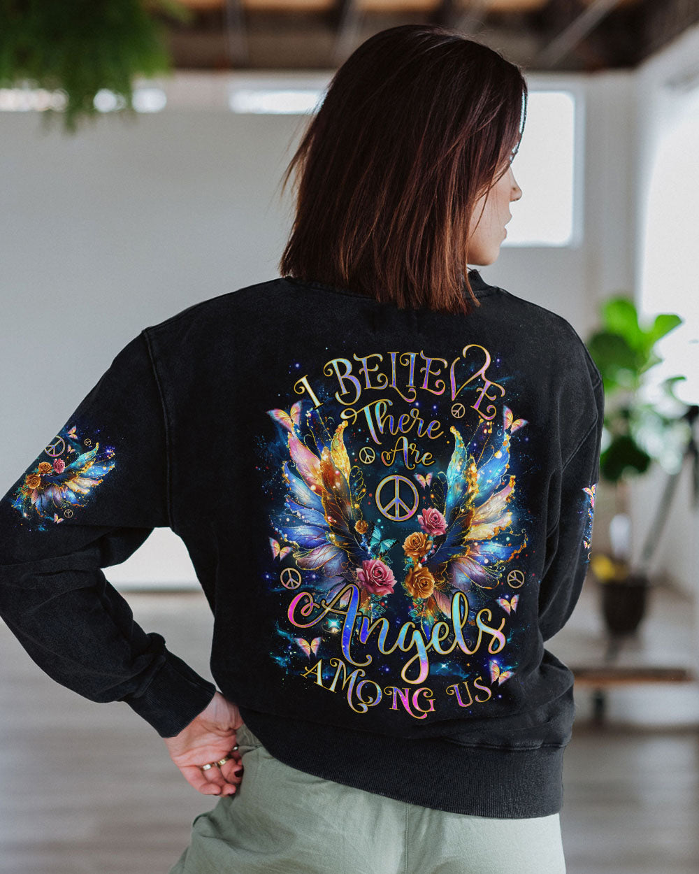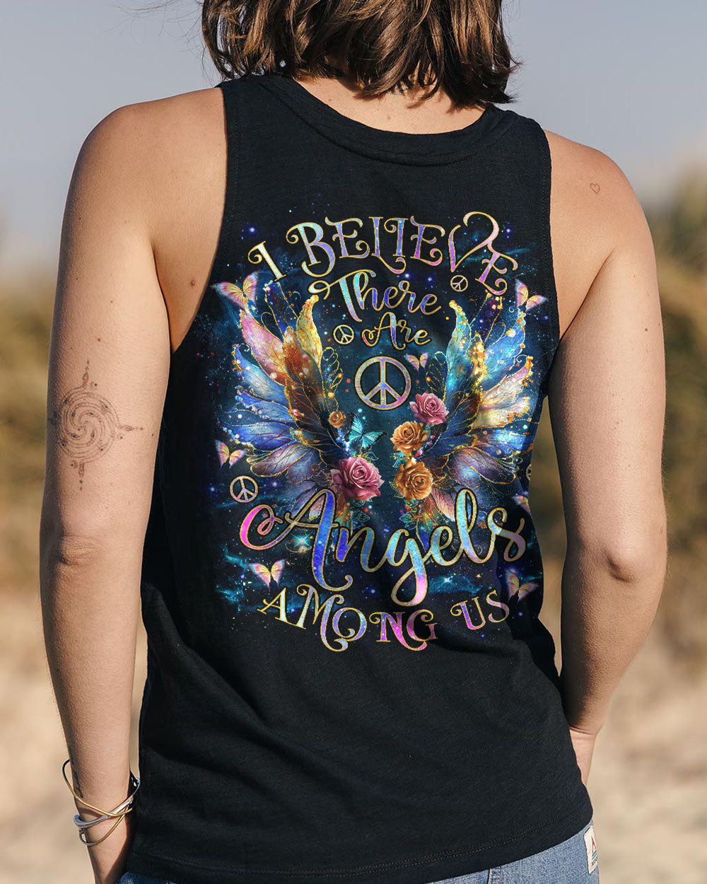 The “I Believe There Are Angels Among Us Wings” all-over print features a beautiful design featuring beautiful angel wings and a heartfelt message of faith and protection. Perfect for those who find comfort in faith and the idea of guardian angels, this print encourages feelings of hope and connection. Made from a soft, breathable fabric, it is ideal for everyday wear. The elegant image brings a touch of spirituality to your wardrobe, reminding you that love and guidance always surround you.