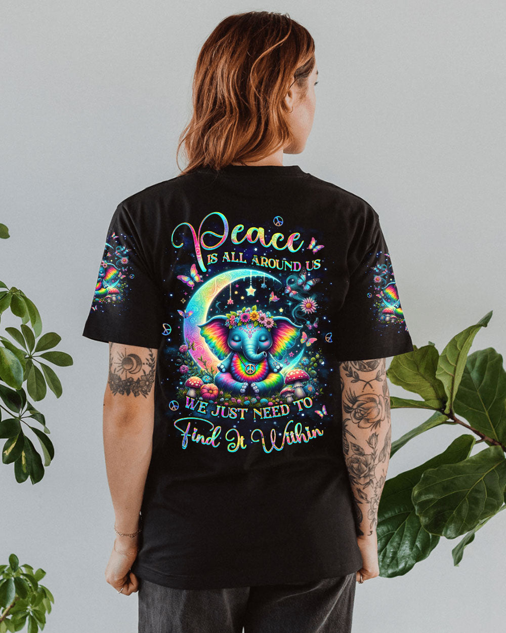 The all-over print “Peace Is All Around Us Elephant” features a serene design, showcasing majestic elephants with a gentle message of peace and harmony. Perfect for nature lovers and those who appreciate the beauty of wildlife, this print encourages mindfulness and tranquility. Crafted from a soft, breathable fabric, it’s ideal for everyday wear. The calming imagery brings a light touch to your wardrobe, reminding you to appreciate the peace in every moment.