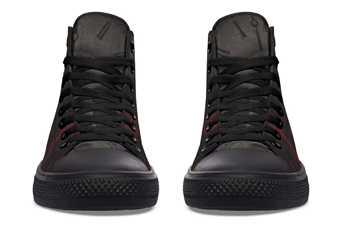 - Step into style with our High-Top Sneakers, featuring a full canvas double-sided print with rounded toe construction.