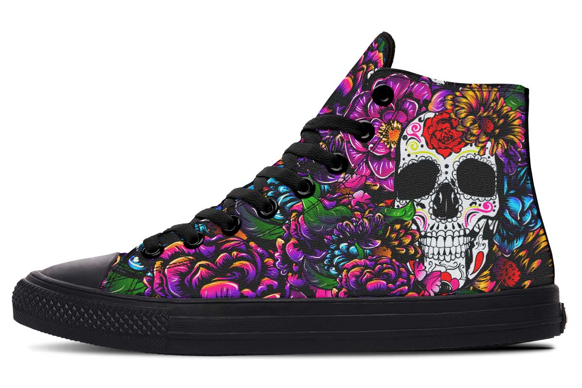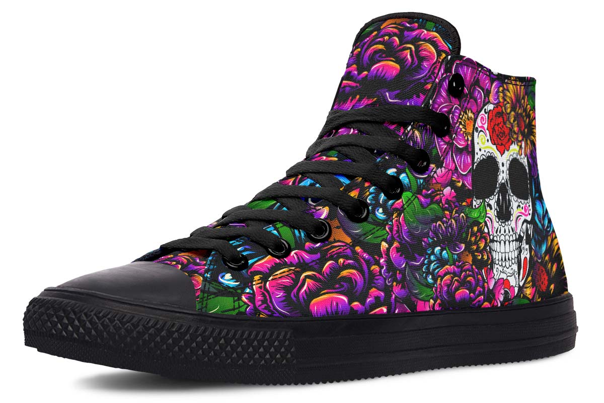 - Step into style with our High-Top Sneakers, featuring a full canvas double-sided print with rounded toe construction.