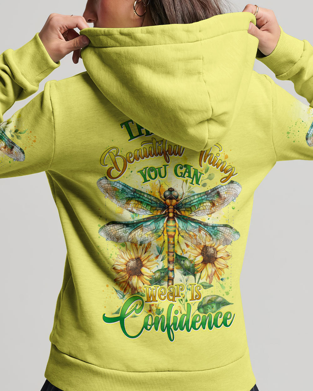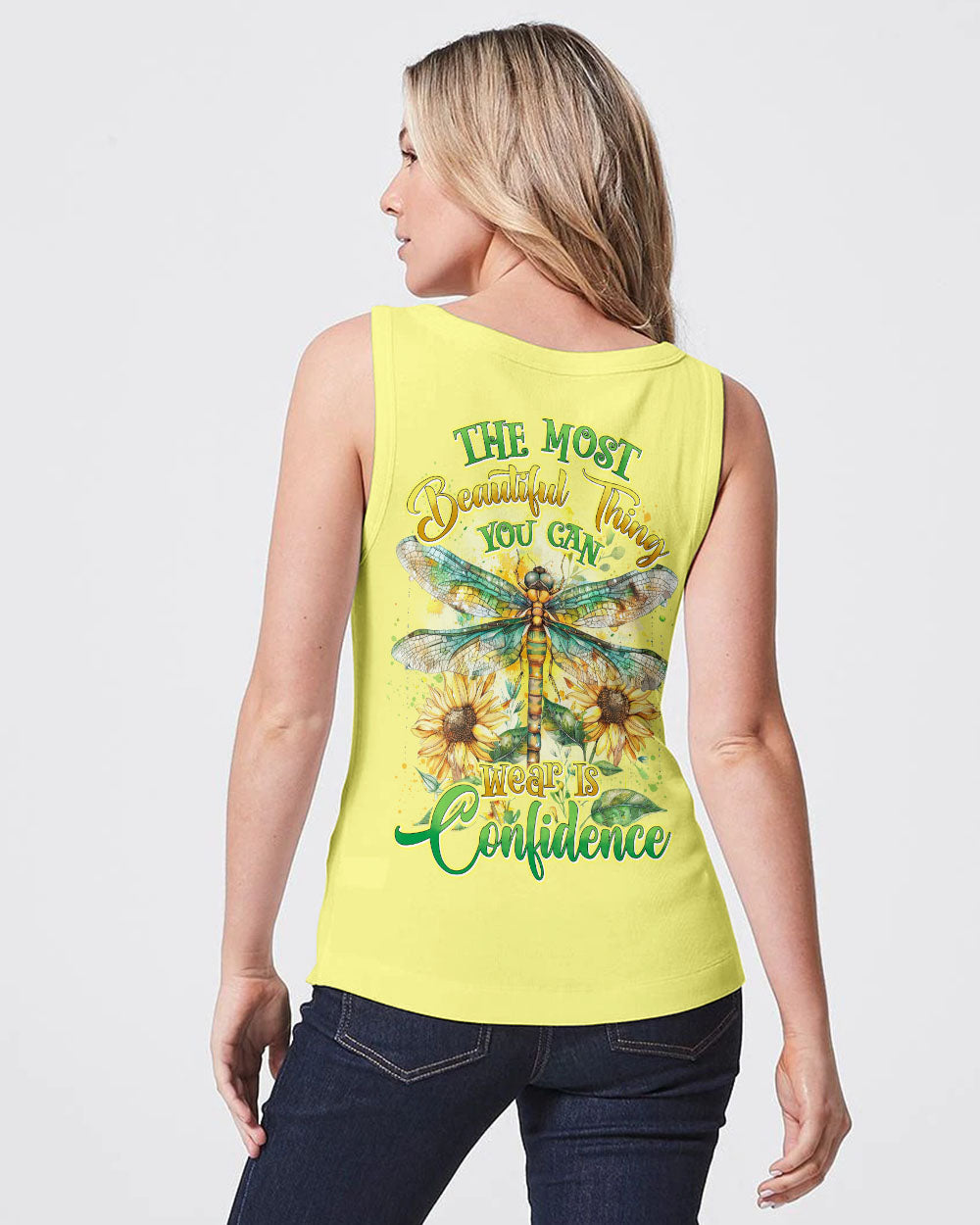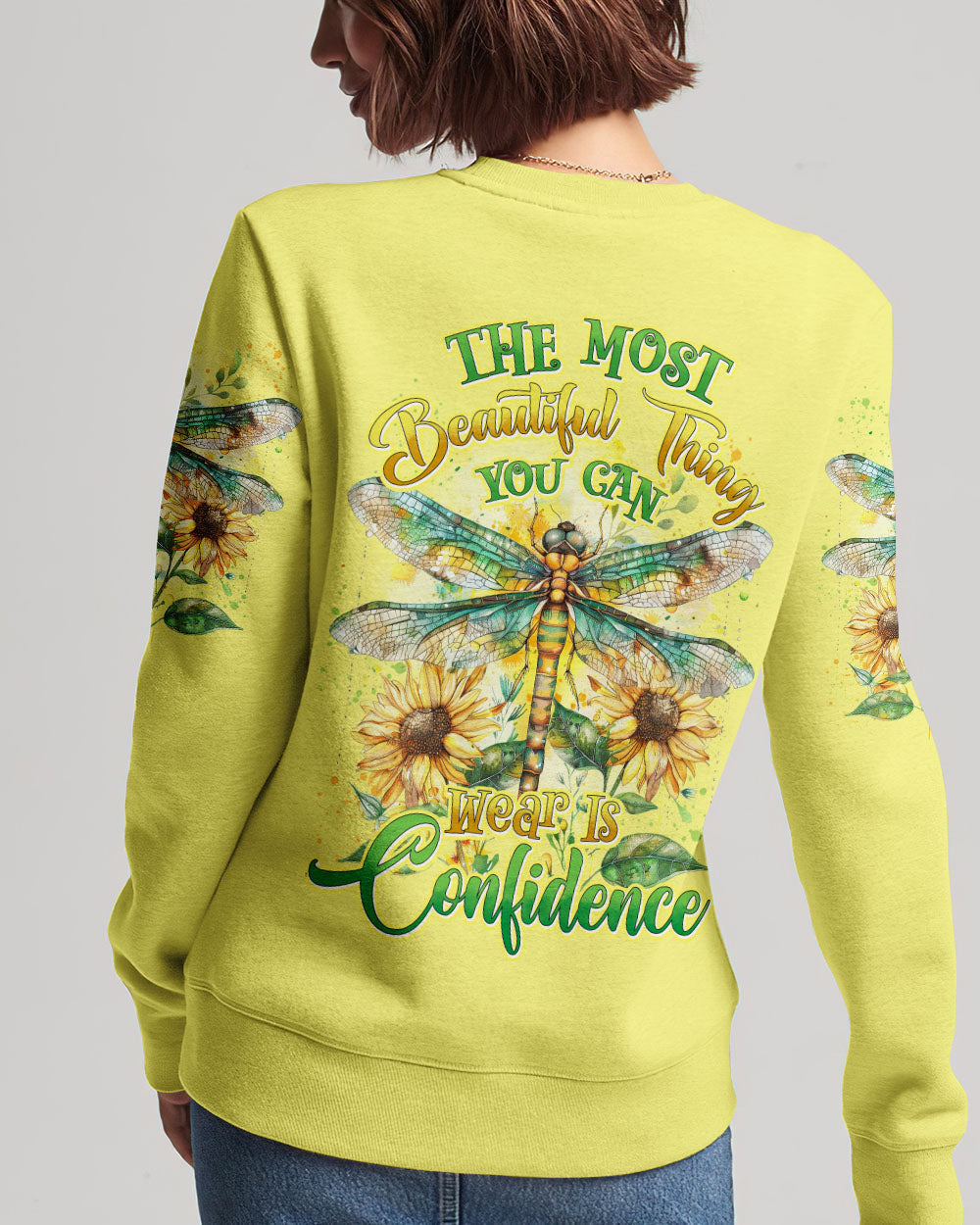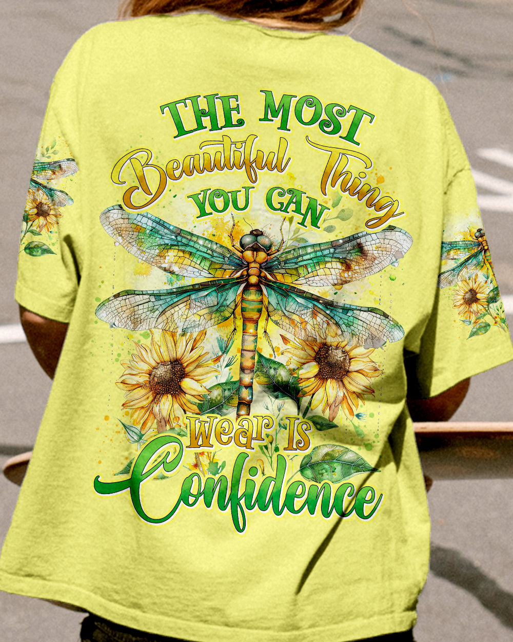 The all-over print "The Most Beautiful Thing Dragonfly" features a captivating design that showcases delicate dragonflies alongside an inspiring message of beauty and grace. Perfect for those who appreciate nature and its wonders, this print exudes a sense of peace and elegance. Crafted from a soft, breathable fabric, it is ideal for everyday wear. This lovely print adds a touch of glamour to your wardrobe, reminding you to recognise and celebrate the beauty around you.