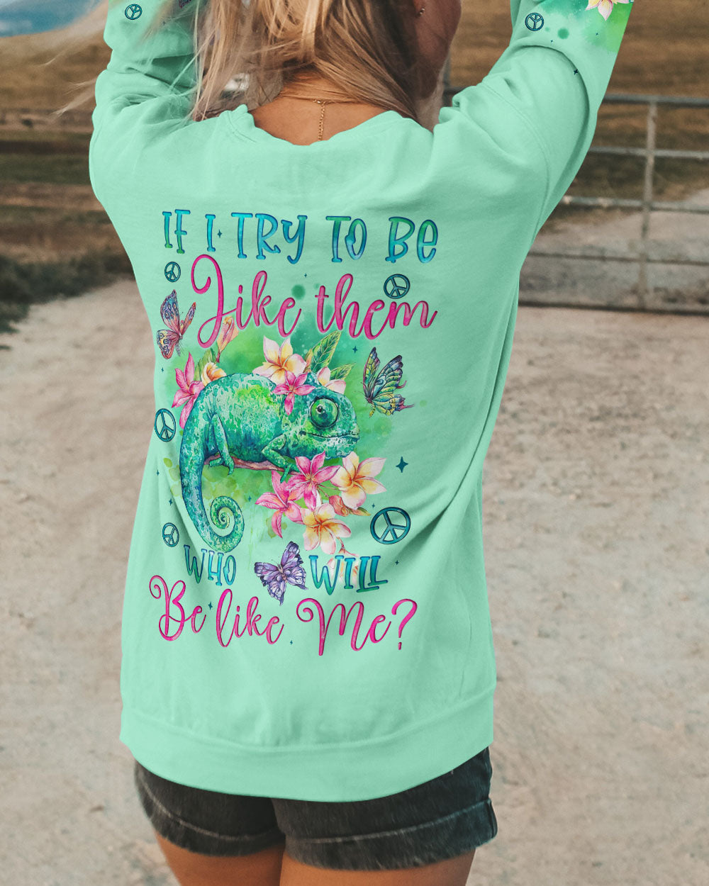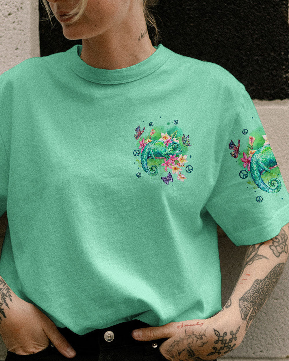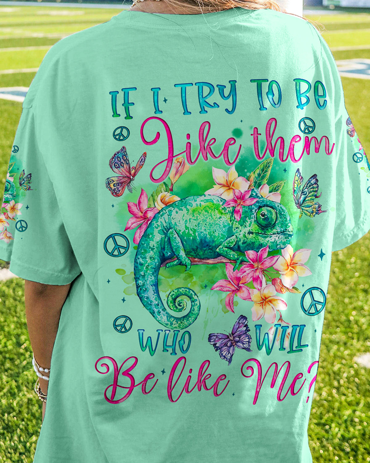 The all-over print "Who Will Be Like Me Chameleon" features a vibrant design of colorful chameleons and a playful, thought-provoking message. Perfect for those who celebrate their unique personality and perspective, this print encourages self-acceptance and confidence. Made from soft, breathable fabric, it's perfect for everyday wear. The eye-catching graphic adds a playful touch to your wardrobe, reminding you to celebrate what makes you unique.