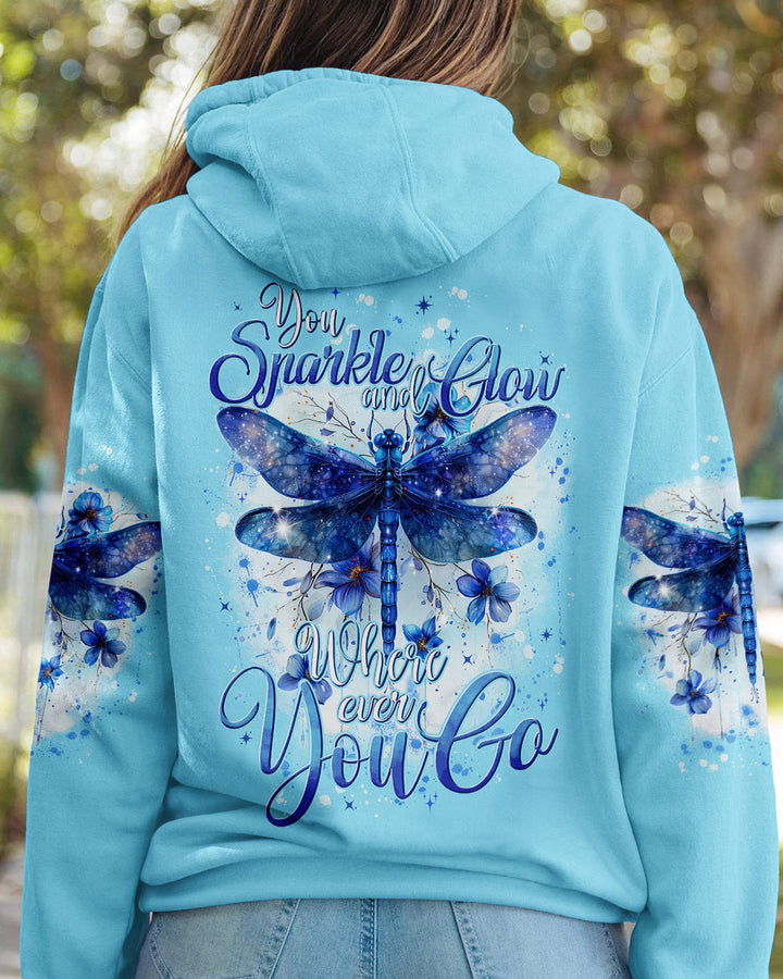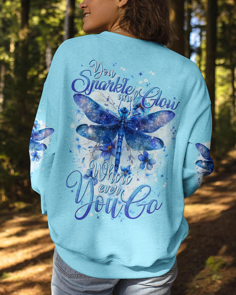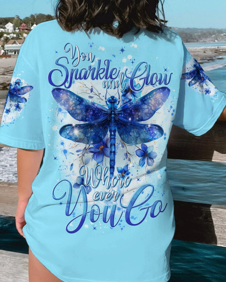 The all-over print "You Sparkle and Glow Dragonfly" features a vibrant design featuring beautiful dragonflies along with a playful, upbeat message. Perfect for those who embrace their uniqueness and radiate positivity, this print encourages self-expression and confidence. Crafted from a soft, comfortable fabric, it's ideal for everyday wear. The eye-catching graphic adds a bright touch to your wardrobe, reminding you to let your true colours shine and inspire others.