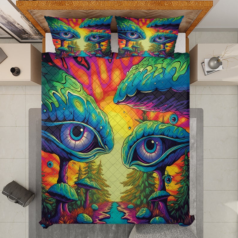 Abstract Grateful Mushroom Hippie Bedding Set: This bedding set features an abstract design of grateful mushrooms, bringing a vibrant, hippie-inspired look. The colorful and quirky pattern adds a playful and eclectic touch to your bedroom decor.