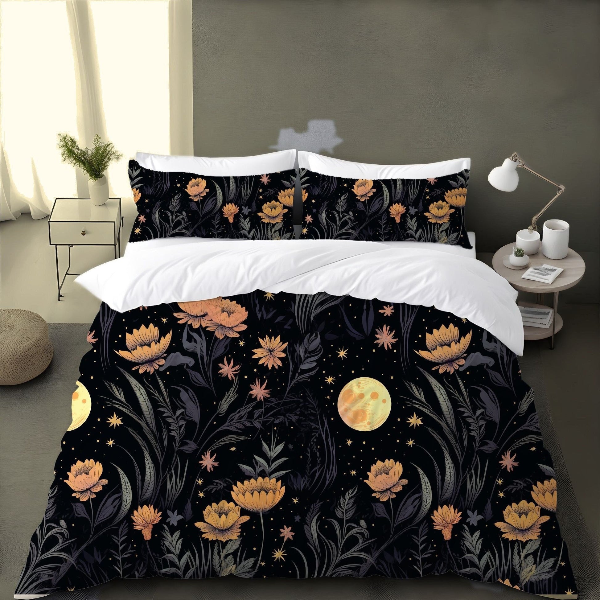Hippie Art Zone - Garden of Shadows Floral, Halloween Witchy Flowers Bedding Set For Hippies