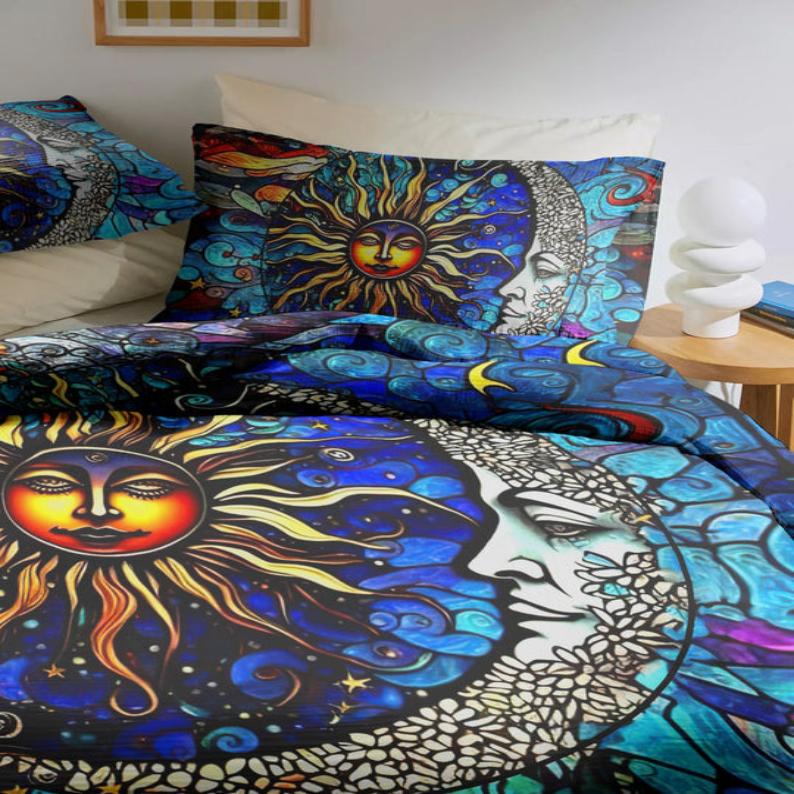 Transform your bedroom into a bohemian oasis with the Sun and Moon Bedding Set. Featuring a vibrant celestial design, this set embodies the free spirit of the hippie lifestyle. Made from soft, breathable fabric, the set includes a duvet cover and pillowcases adorned with intricate sun and moon motifs, perfect for adding a touch of cosmic charm to your space. Embrace your inner traveler and sleep under the stars every night!