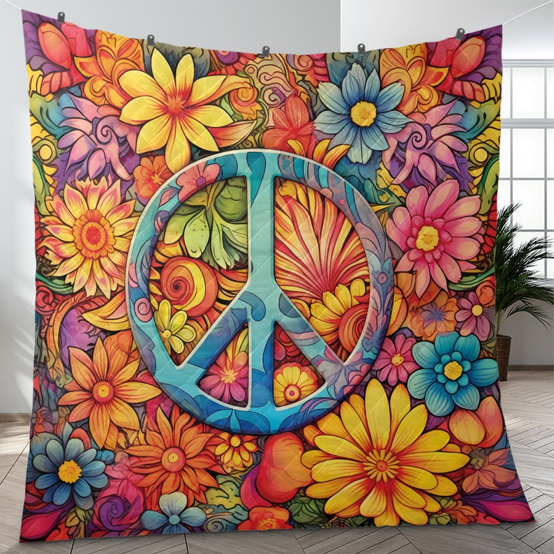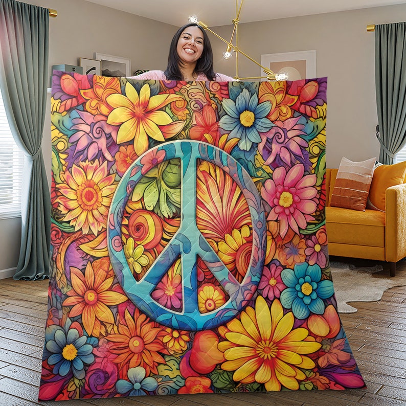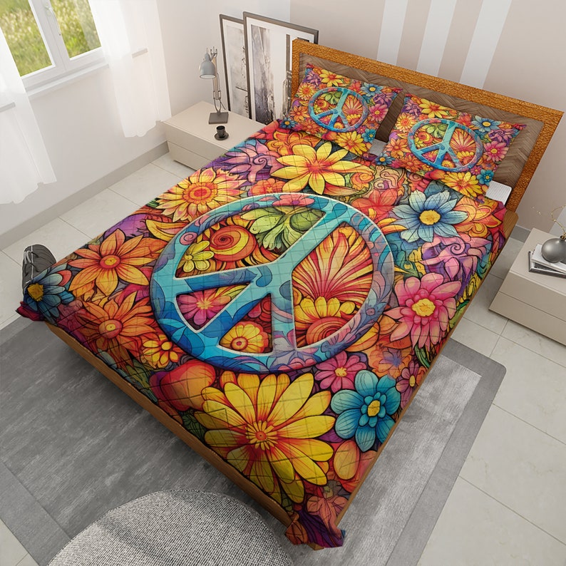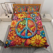 Vintage Sunflower Peace Hippie Bedding Set: This bedding set features a vintage design with sunflowers and peace symbols. The vintage-inspired pattern captures the hippie feel, combining colorful sunflowers with a peace motif to create a unique, comfortable look for your bedroom.