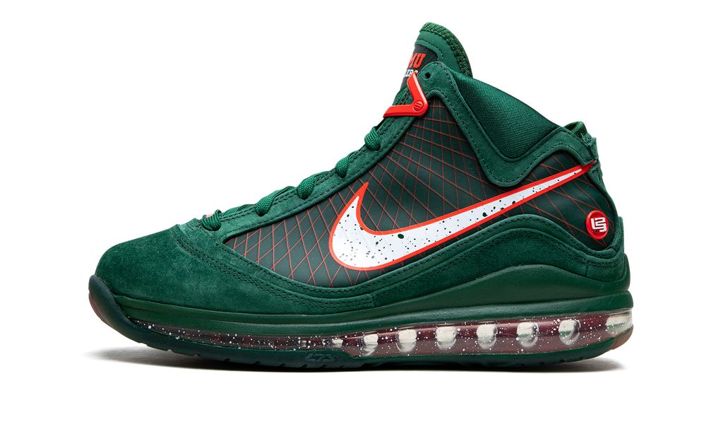 The Nike LeBron 7 “Florida A&M” is a colorway of LeBron James’s seventh signature shoe with Nike Basketball that shows love to the University of Florida A&M and its athletic programs. The “Florida A&M” design features the team uniform colors found on the Historically Black University’s sports teams. A buttery soft Gorge Green suede mudguard meshes with tonal suede overlays throughout. Orange Flywire detailing is embedded within the base. A white Swoosh with green speckle detailing and orange trim appears on the mid-panel, a mini orange “L23J” emblem covers the heel and LeBron James’s signature dots the tongue. Heel-to-toe visible Air provides comfort whether on the court or the streets.